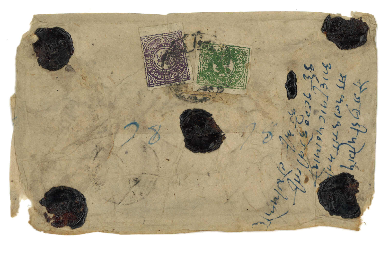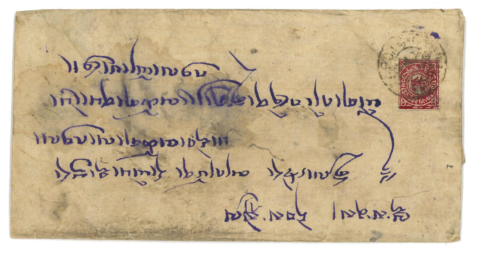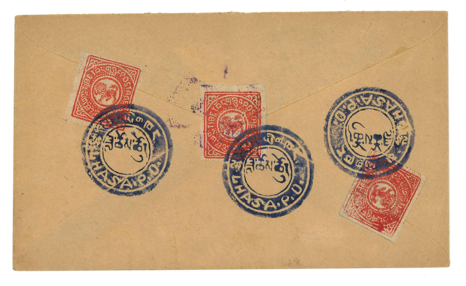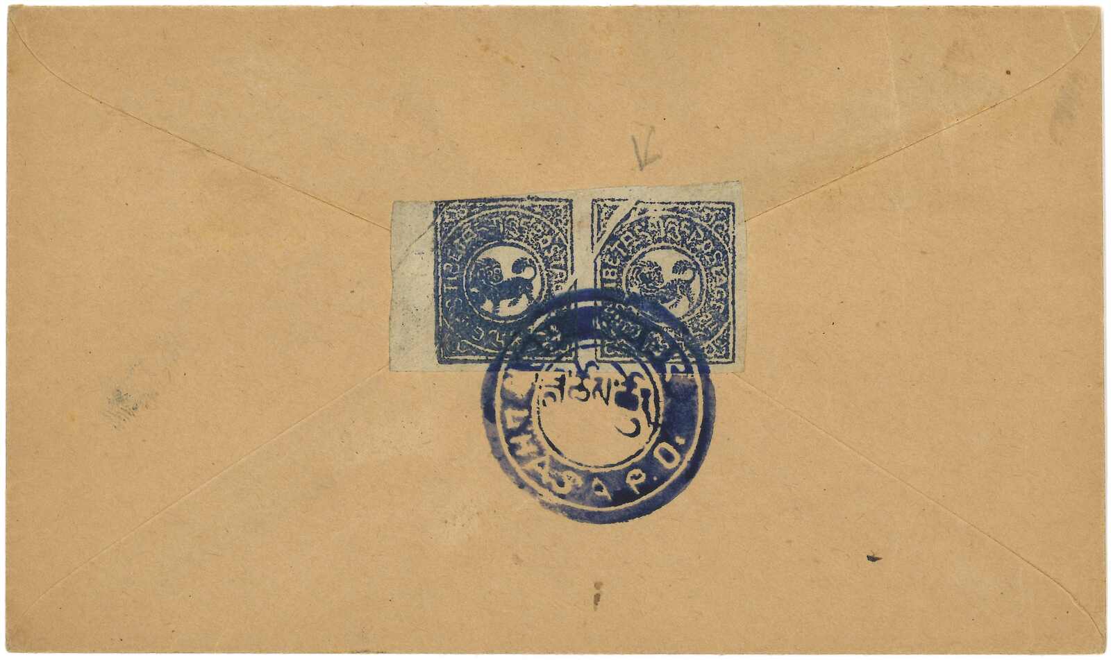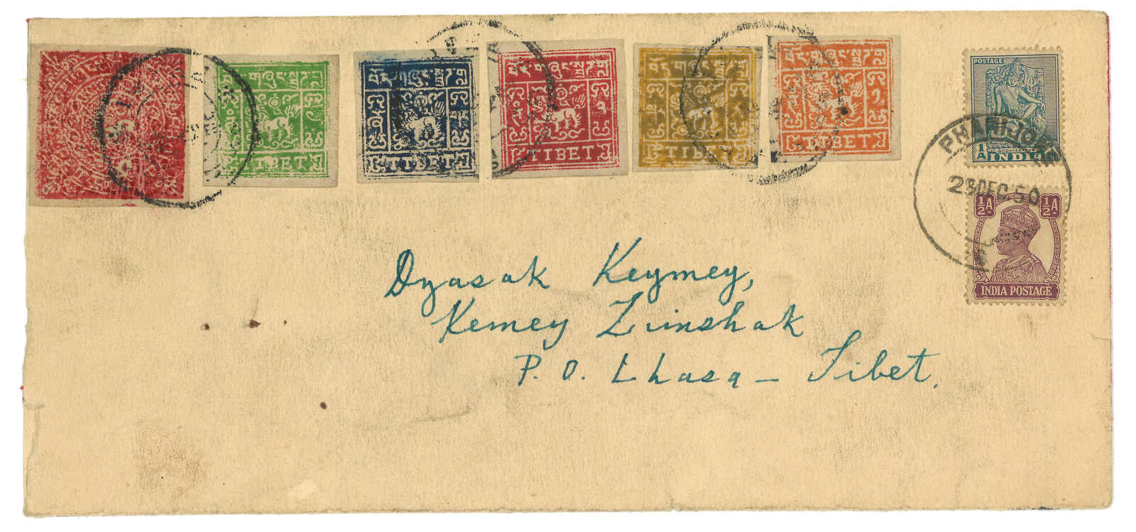1950年由George Tsarong自帕里宗寄拉薩,貼少見之西藏獅圖第二版早期有光墨8章噶 + 第三版5枚,銷帕里圓戳。加貼印度票1安娜 + 半安娜,銷帕里宗英局12.29日戳。George Tsarong為噶廈秘書。雖為集郵封,但信封貼用第二版少見。(Image 1)