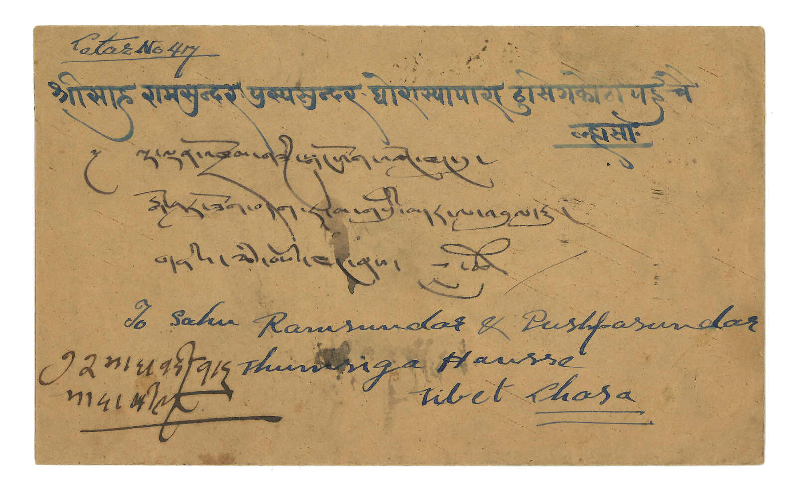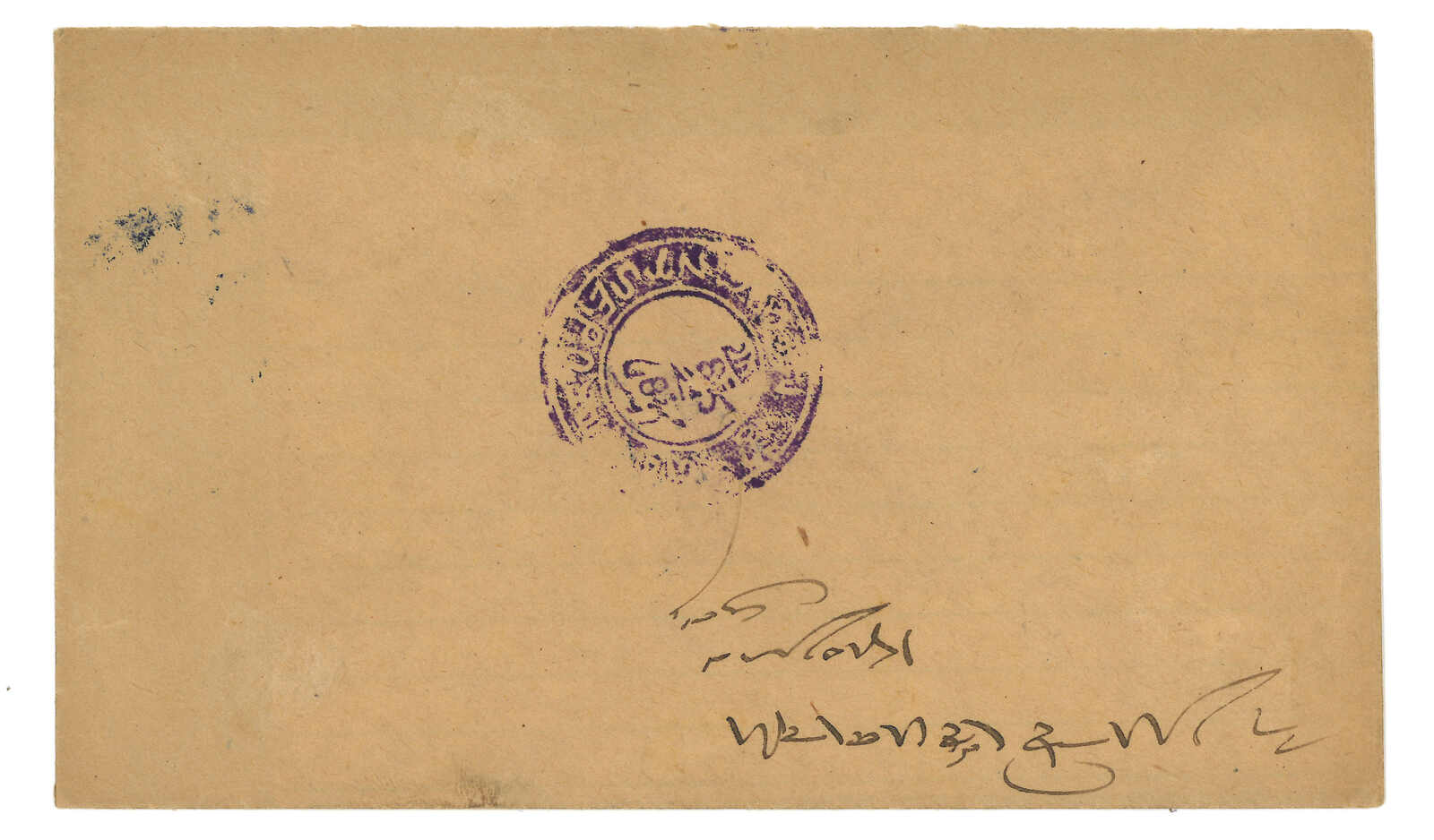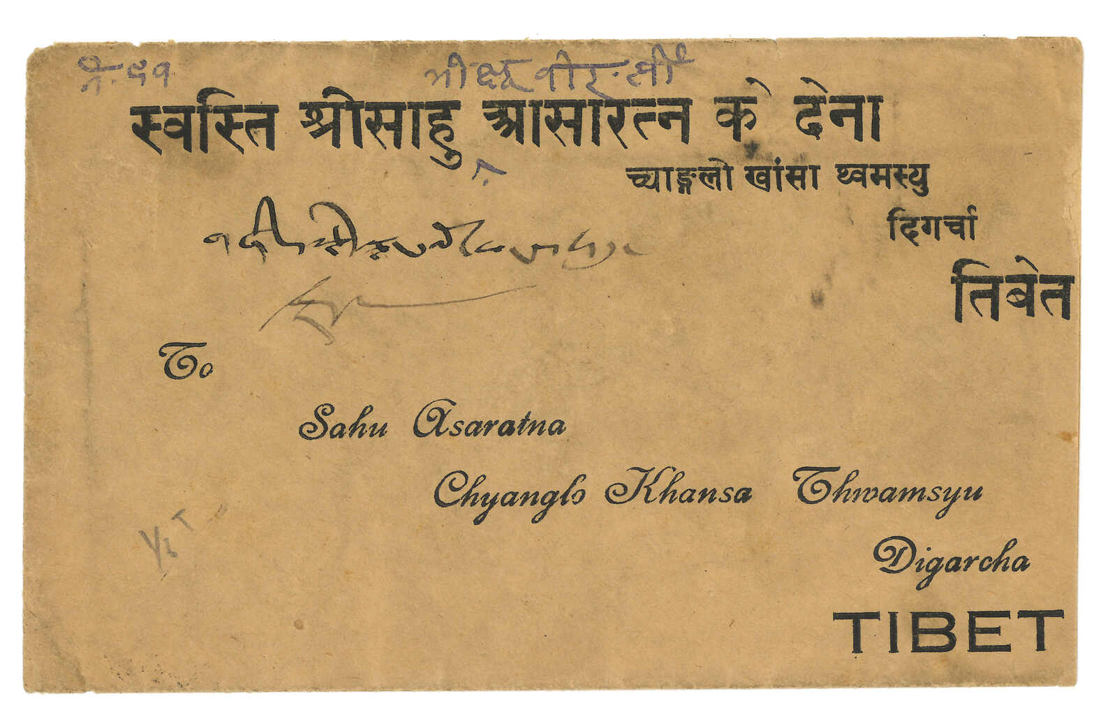 1950年由George Tsarong自帕里宗寄拉Kalimpong,貼少見之西藏獅圖第二版早期有光墨8章噶 + 第三版5枚,銷帕里圓戳。加貼印度票1安娜 + 半安娜,銷帕里宗英局12.29日戳。George Tsarong為噶廈秘書。雖為集郵封,但信封貼用第二版少見。(Image 1)