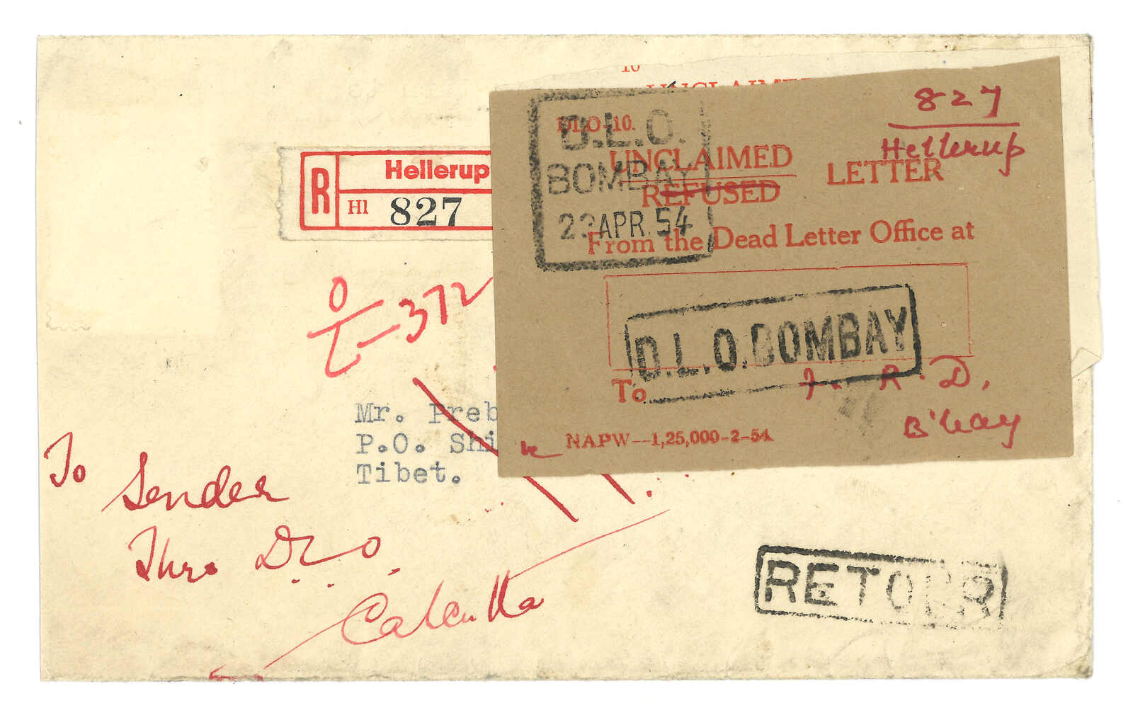 1954 Denmark (4 Feb) to Shigatse, returned to sender. Registered cover, f.w. Danish issue 3x 30 ore (one stamp lost), tied by Hellerup cds, alongside with registered label. Arrived Gyantse (5 May). Showing “no postal serivce