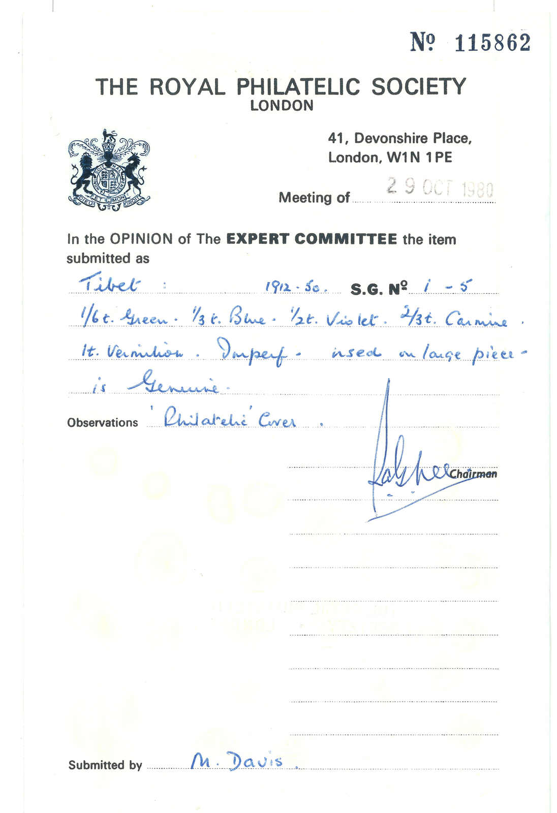 一件貼有西藏獅圖第一版5枚之信封剪片,由1/6章噶至1章噶,鈐拉薩V型戳記。附皇家郵學會證書。(Image 1)