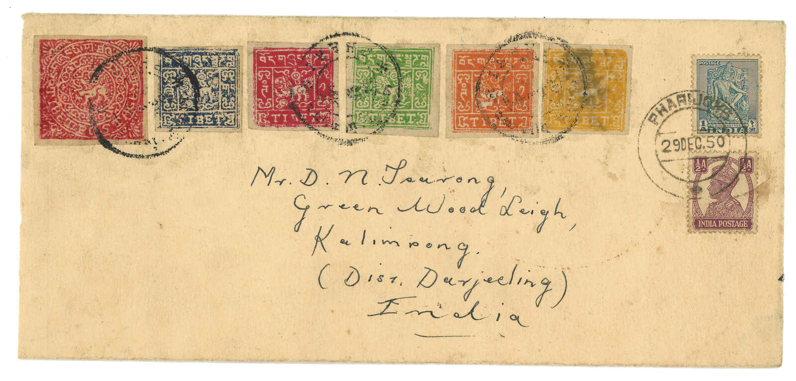 1950 By George Tsarong, Pharijong to Kalimpong, f.w. scarce Tibet 2nd issue early printing shiny enamel 8tr + 3rd issue x5, Phari ciruclar h.s. In combination with Indian 1a + 1/2a, tied by Pharijong BPO (29 Dec) cds. George