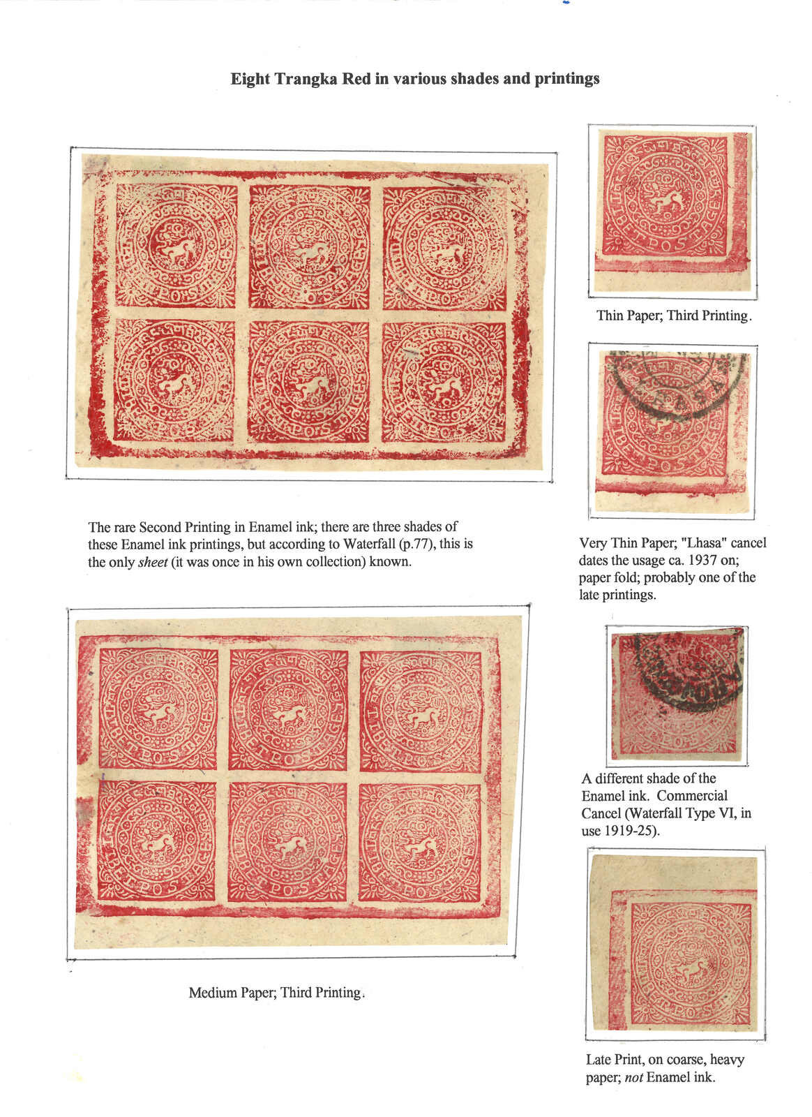 An exhibit page of Tibet 2nd issue 8tr, containing 4 singles and 2 complete sheets, showcasing different ink, printing and cancellation.