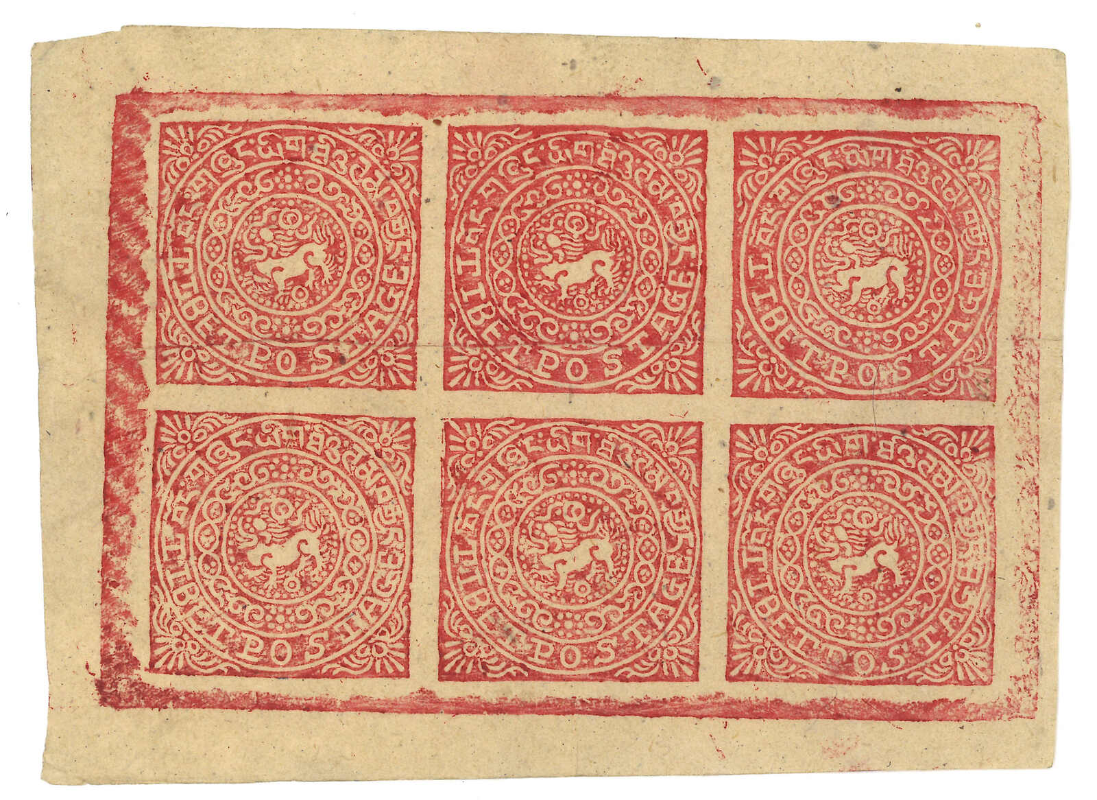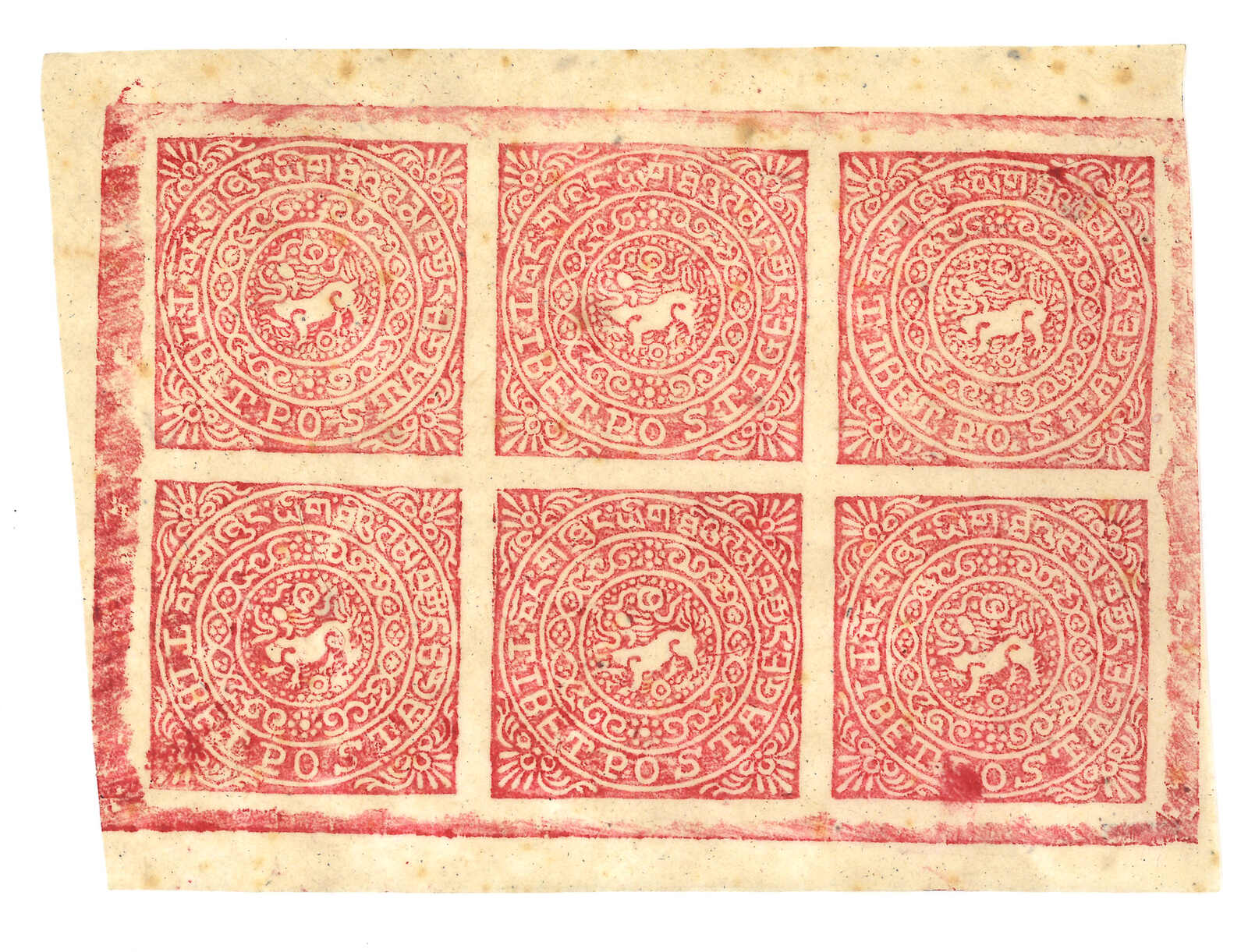 1914年西藏獅圖第二版8章噶玫紅-粉紅全張六枚新,無貼。可能是1950年代再版。(Image 1)