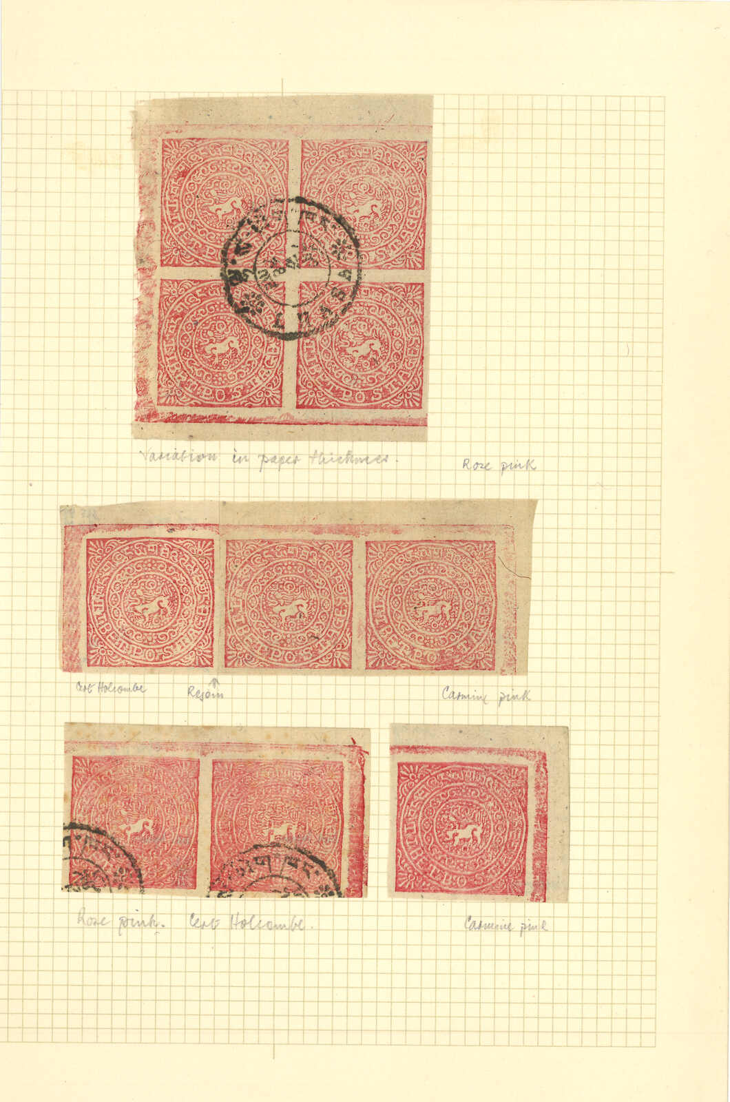 1914年西藏獅圖第二版8章噶連票3件,貼於貼票頁上,展示了不同紙質和刷色。(Image 1)
