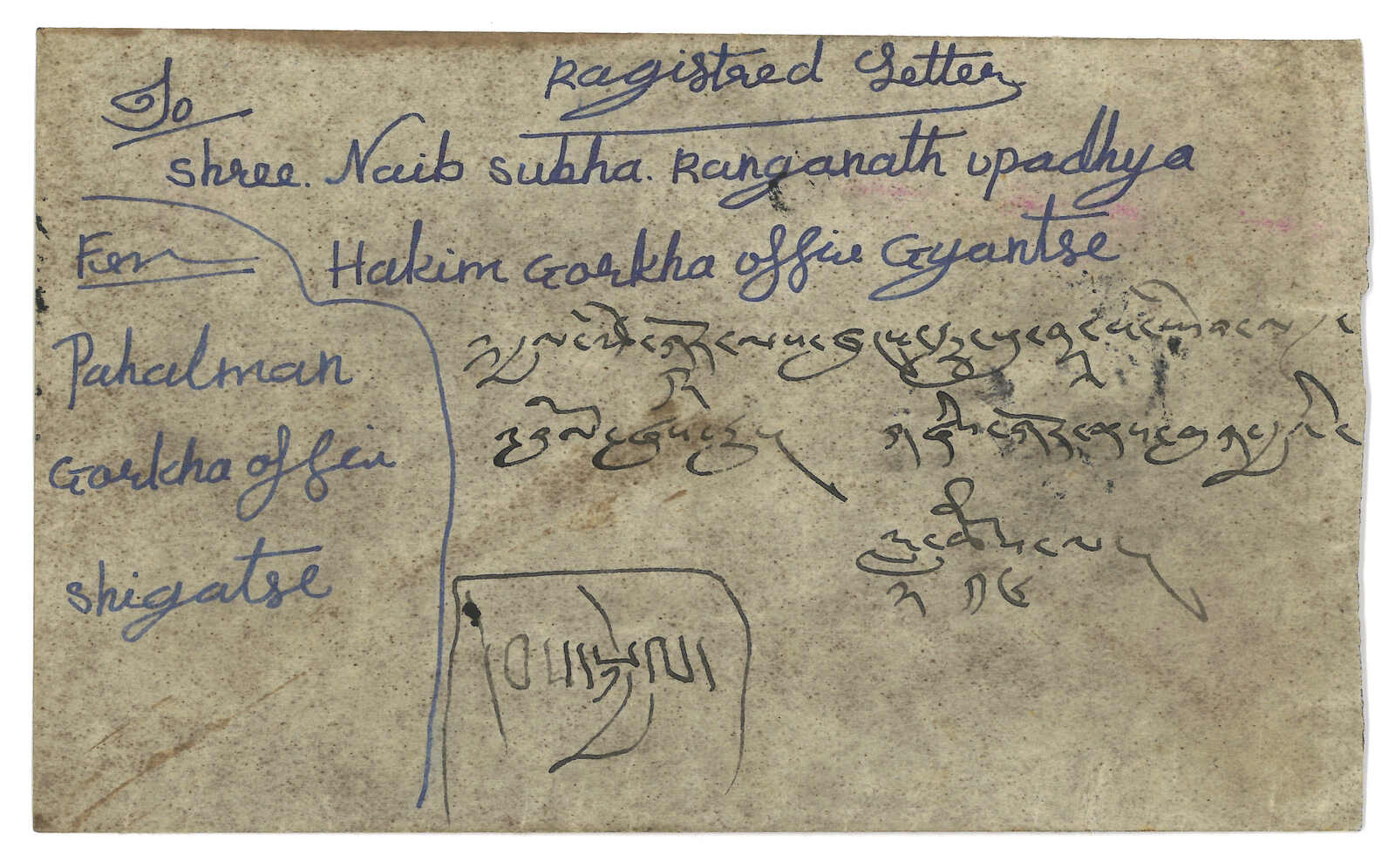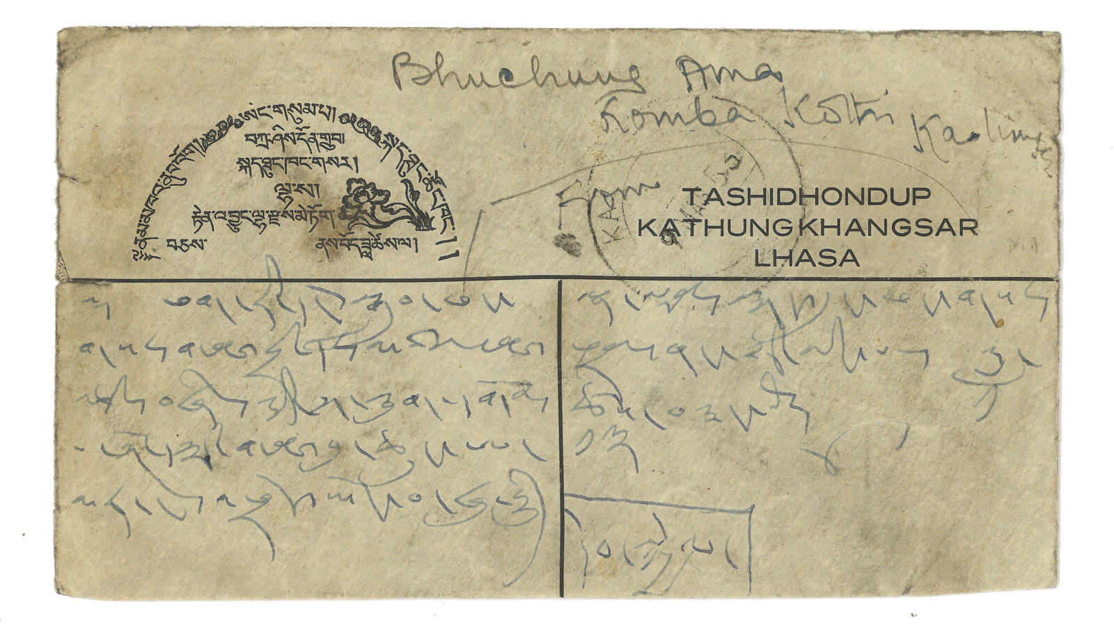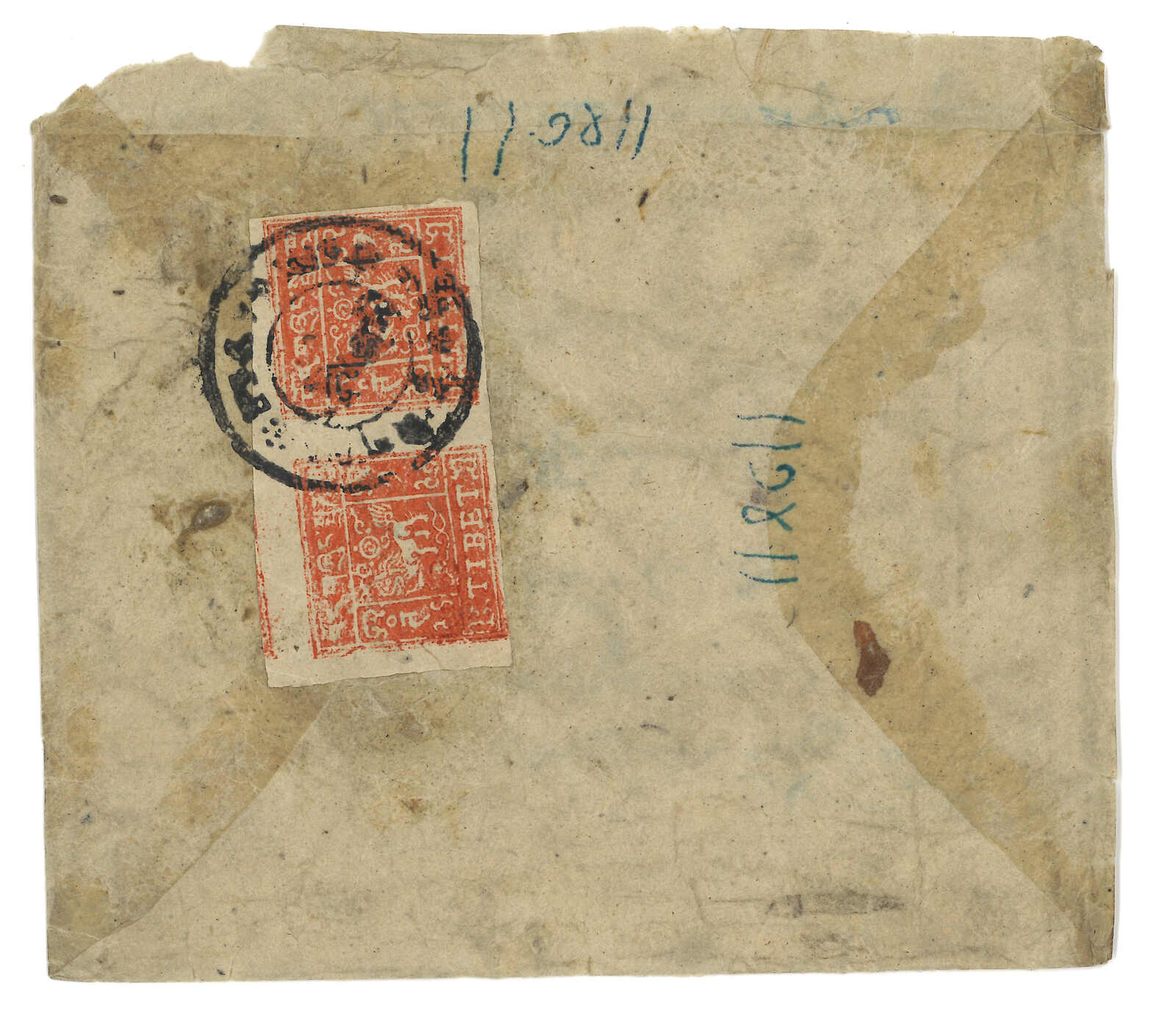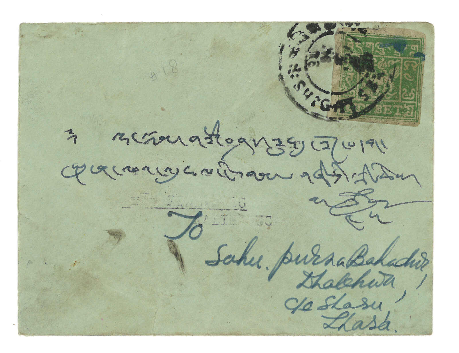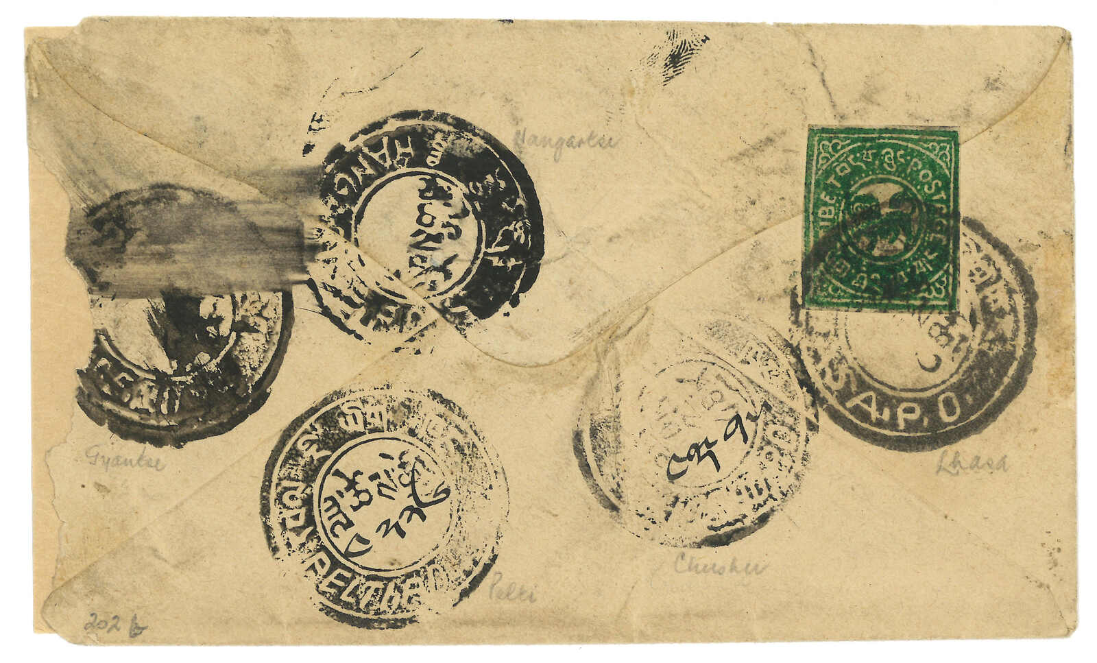 ca 1920s Lhasa to Gyantse, f.w. Tibet 1st issue 1/6tr, on reverse, tied by Lhasa type I negative seal. Transit Chushu, Pelti and Nangartse, all also with type I negative seal plus manuscript dates. Scarce cancellations, not to