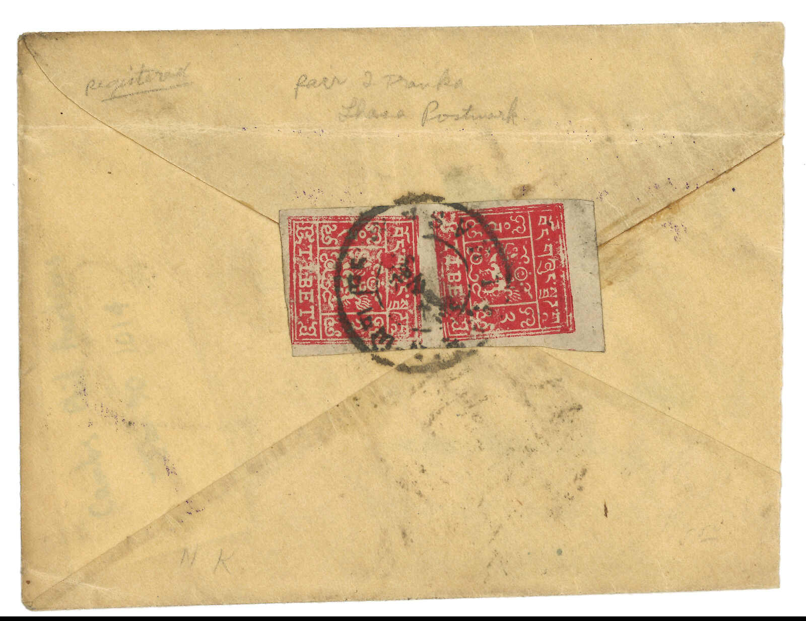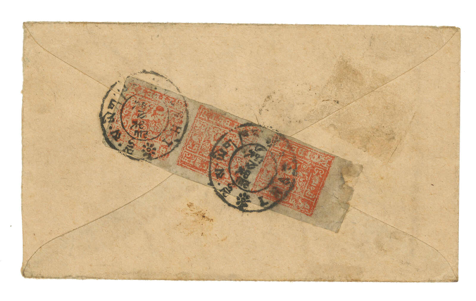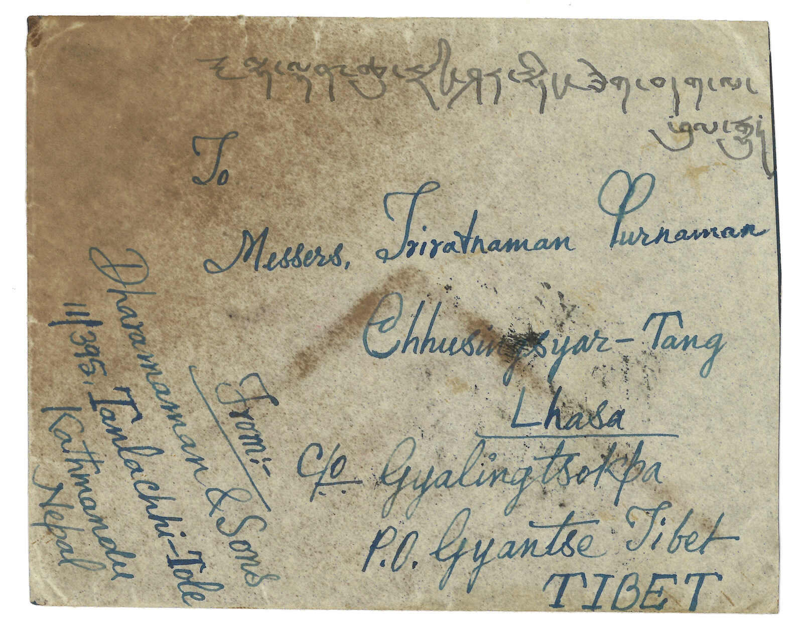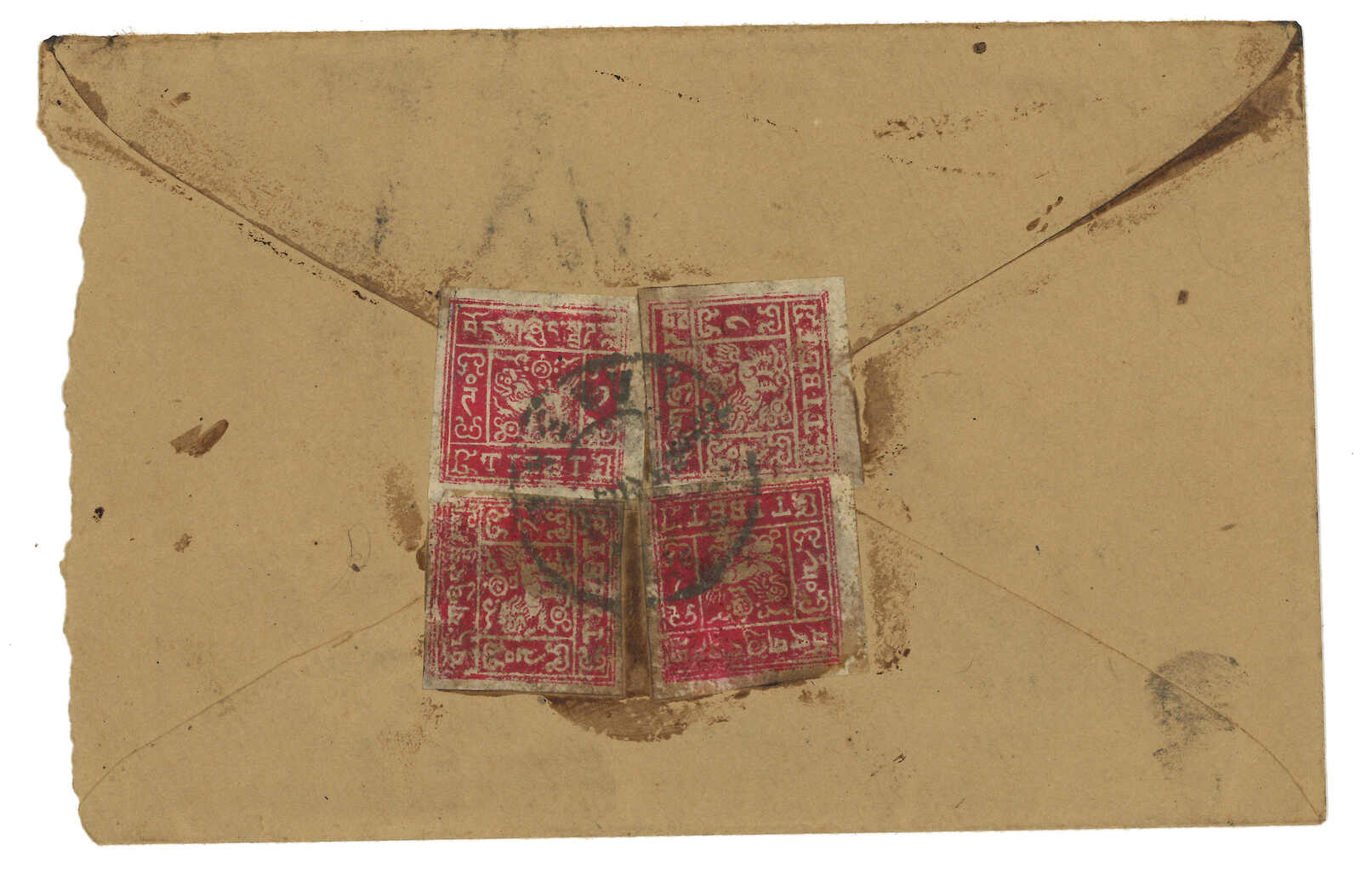 ca 1920s Lhasa to Gyantse, f.w. Tibet 1st issue 1/6tr, on reverse, tied by Lhasa type I negative seal. Transit Chushu, Pelti and Nangartse, all also with type I negative seal plus manuscript dates. Scarce cancellations, not to
