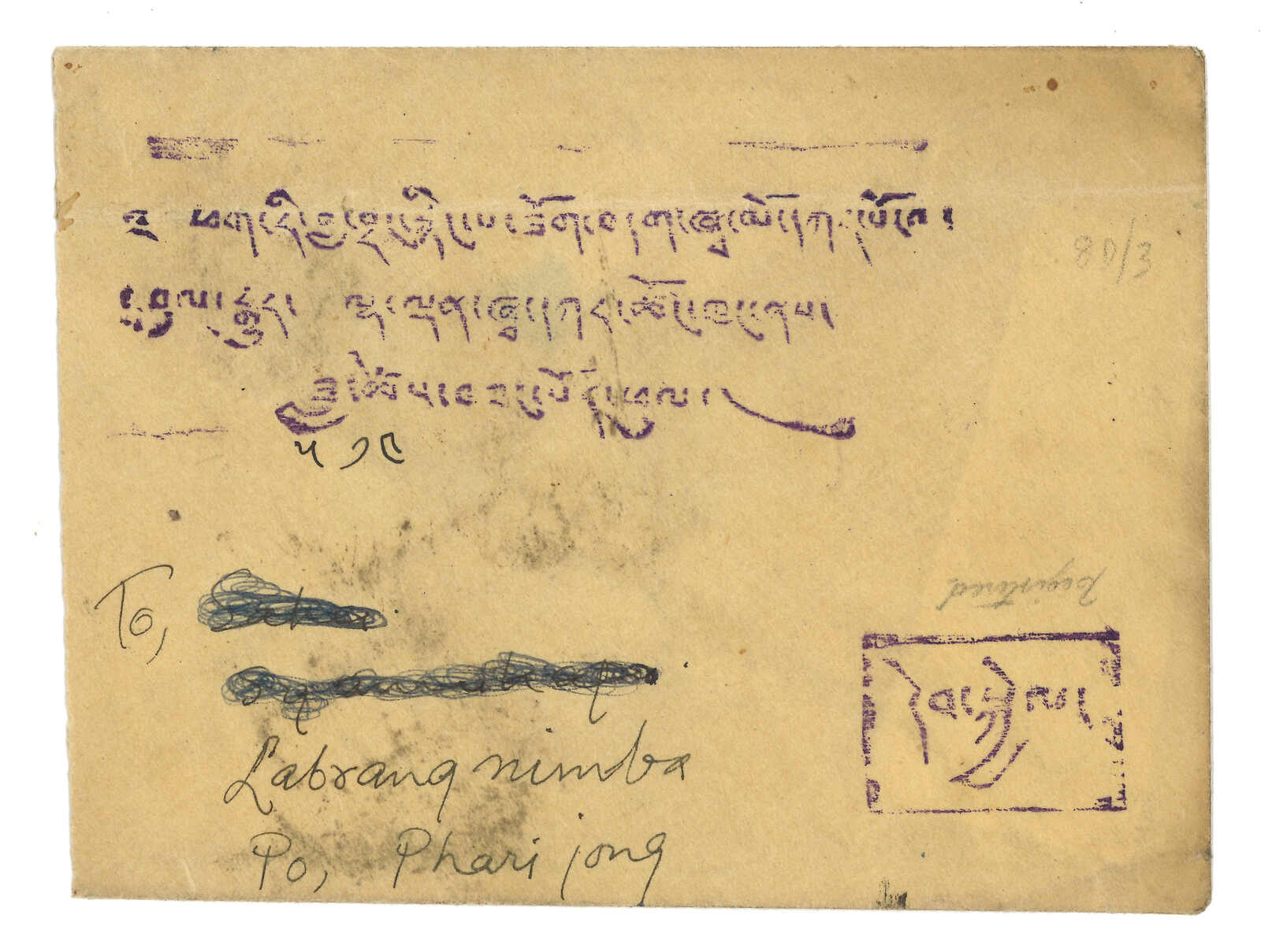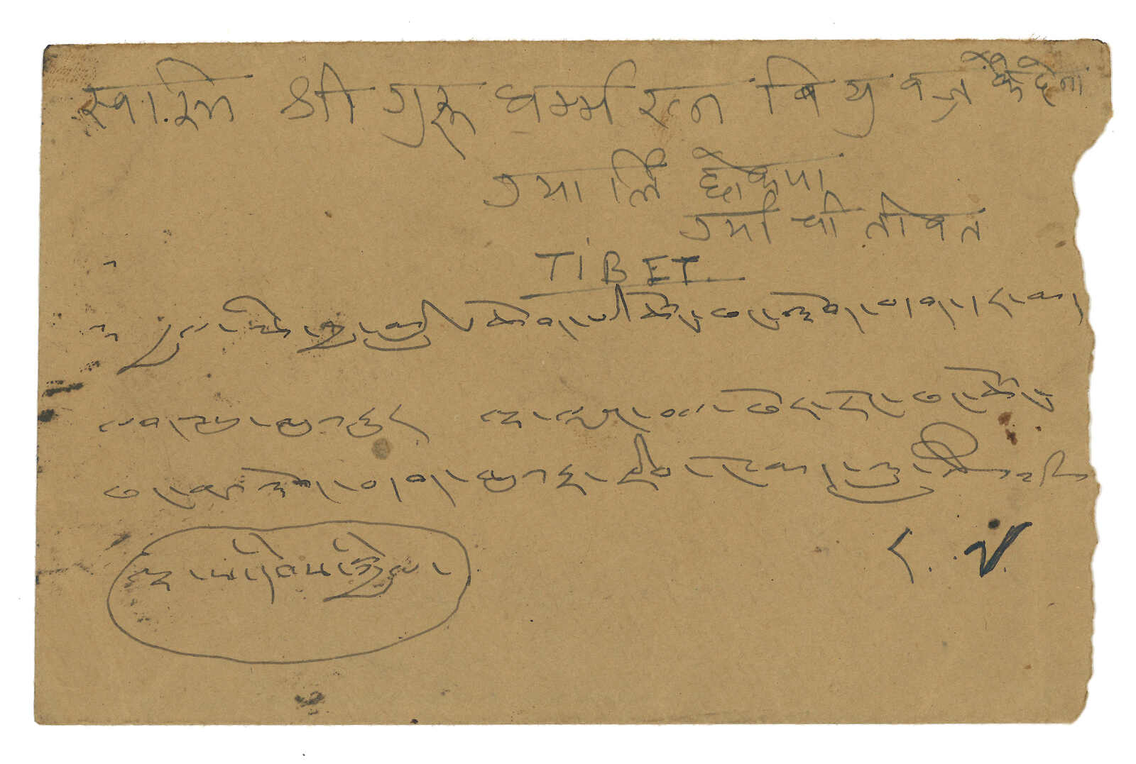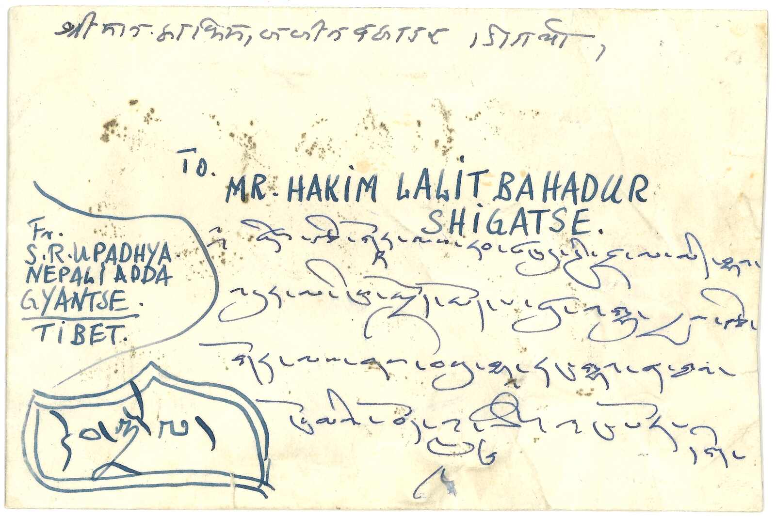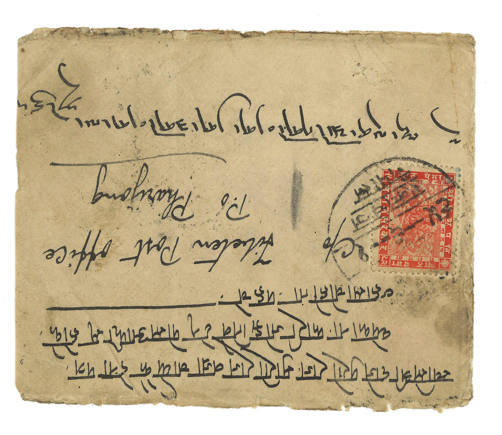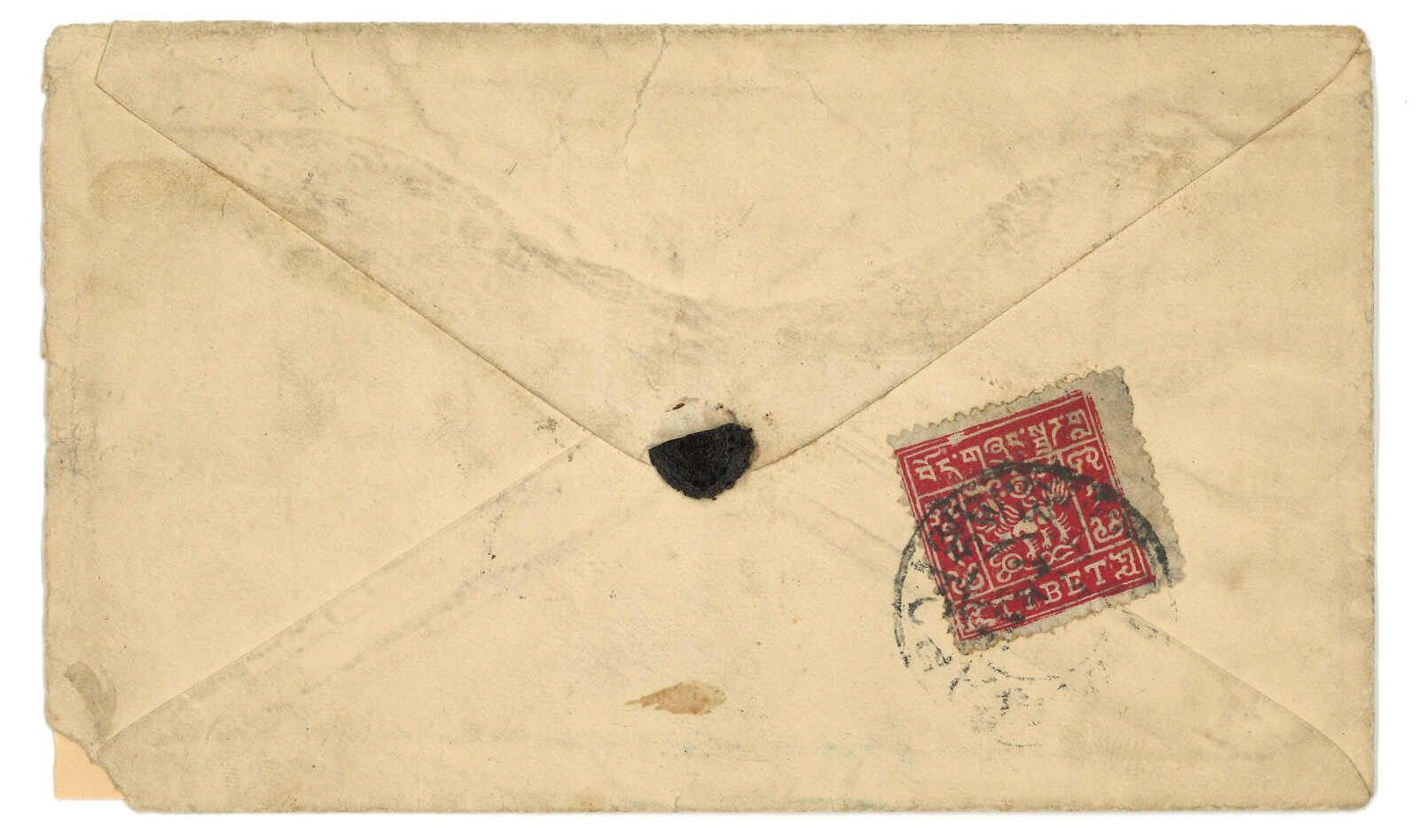 ca 1920s Lhasa to Gyantse, f.w. Tibet 1st issue 1/6tr, on reverse, tied by Lhasa type I negative seal. Transit Chushu, Pelti and Nangartse, all also with type I negative seal plus manuscript dates. Scarce cancellations, not to