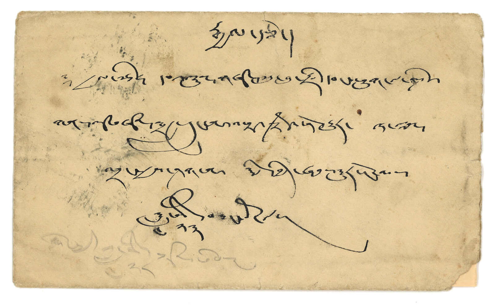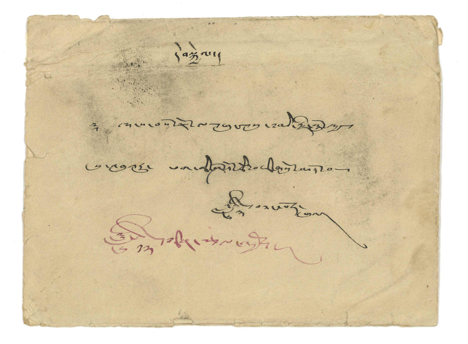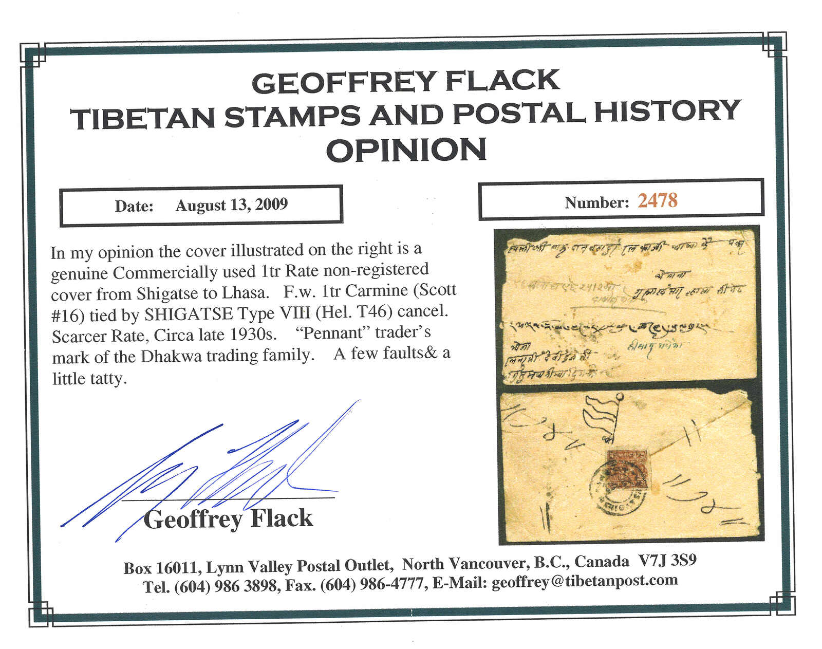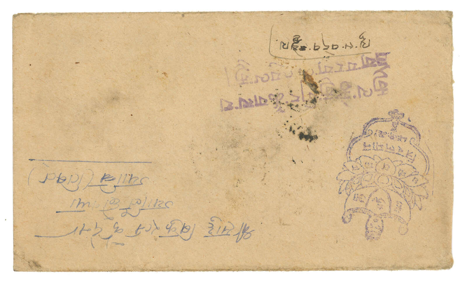 ca 1920s Lhasa to Gyantse, f.w. Tibet 1st issue 1/6tr, on reverse, tied by Lhasa type I negative seal. Transit Chushu, Pelti and Nangartse, all also with type I negative seal plus manuscript dates. Scarce cancellations, not to