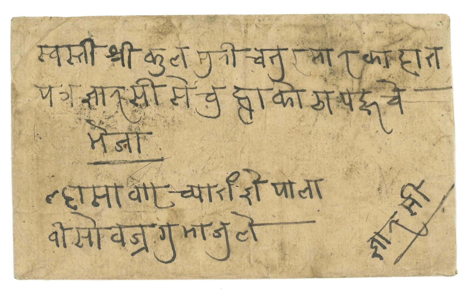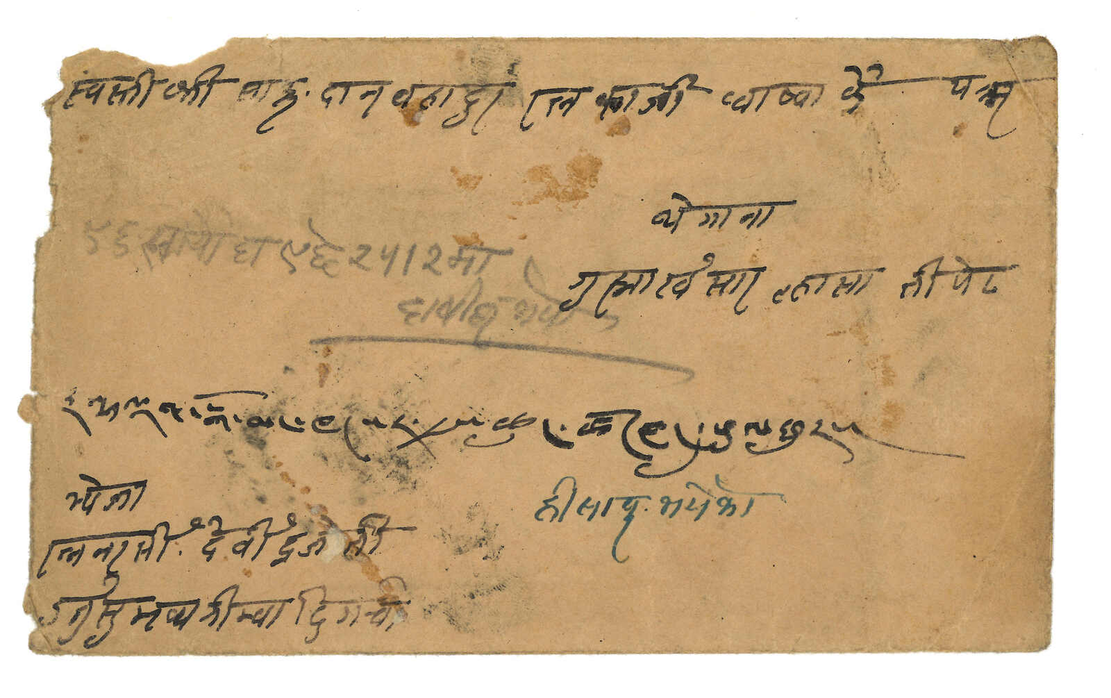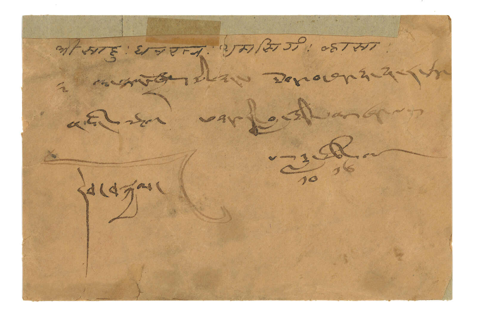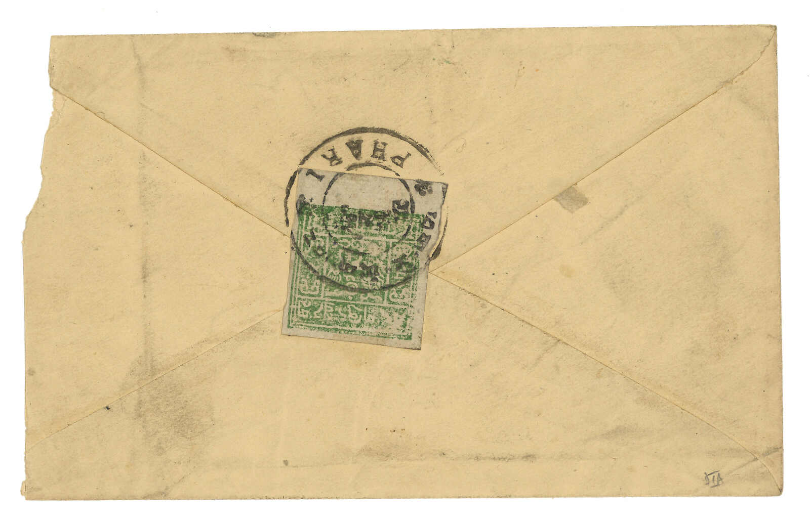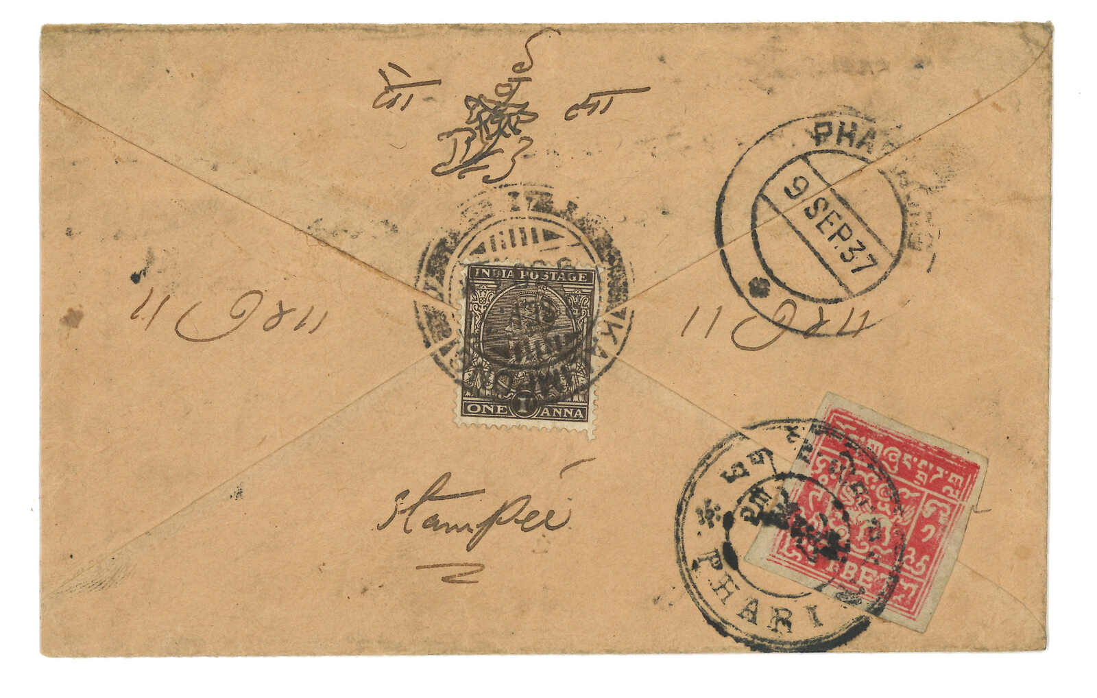 ca 1920s Lhasa to Gyantse, f.w. Tibet 1st issue 1/6tr, on reverse, tied by Lhasa type I negative seal. Transit Chushu, Pelti and Nangartse, all also with type I negative seal plus manuscript dates. Scarce cancellations, not to