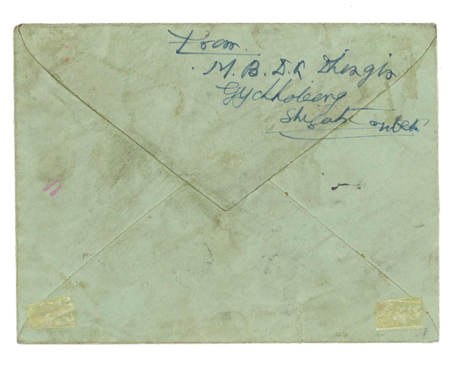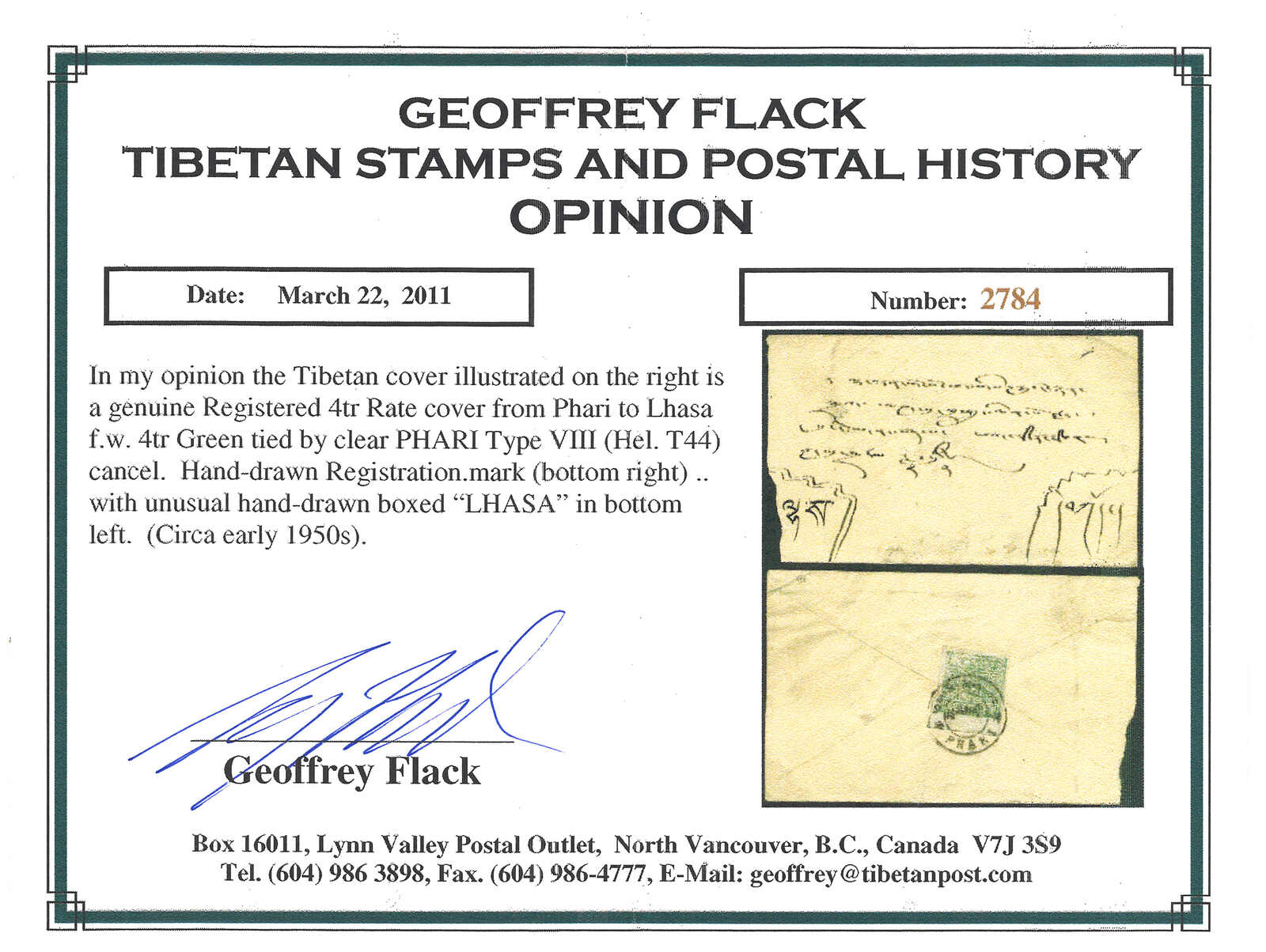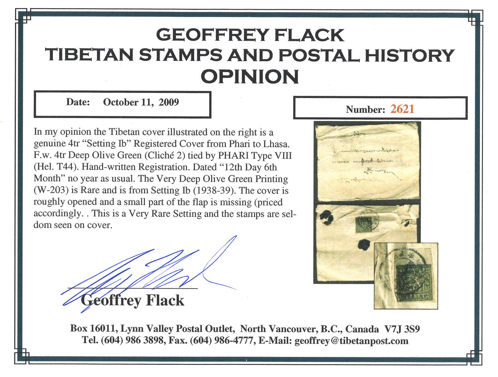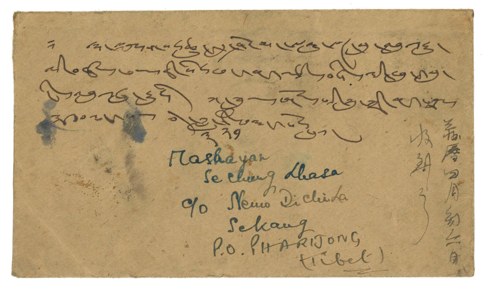 ca 1945 Penam to Lhasa, f.w. Tibet 3rd issue apple green 4tr on reverse, tied by scarce Penam type 2 h.s. Cover rougly opened at right. Commerical cover from Penam is very scarce.