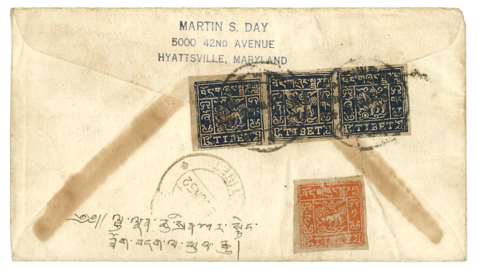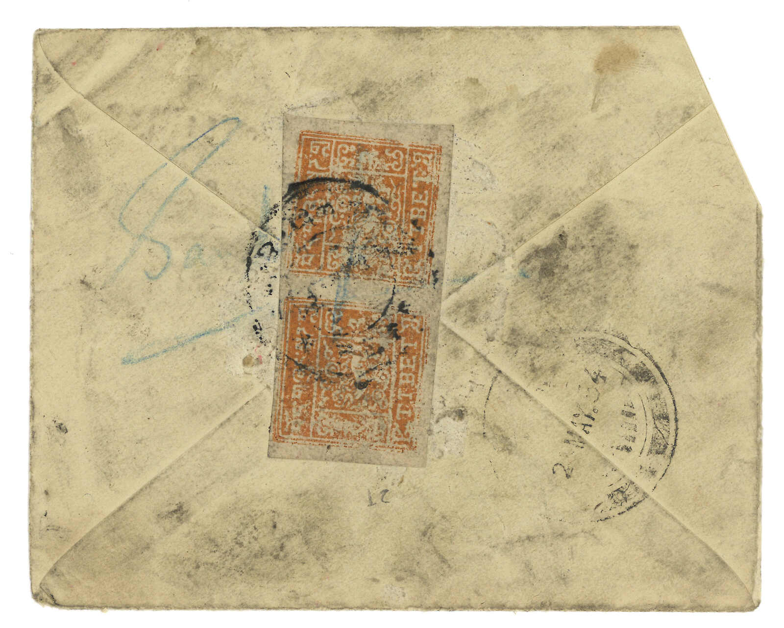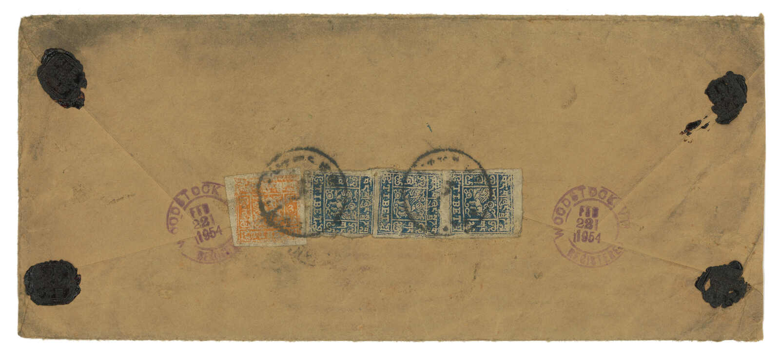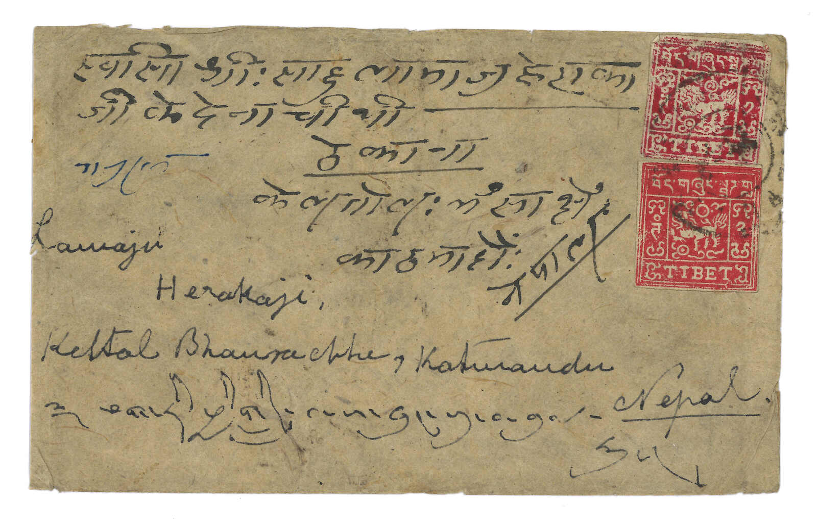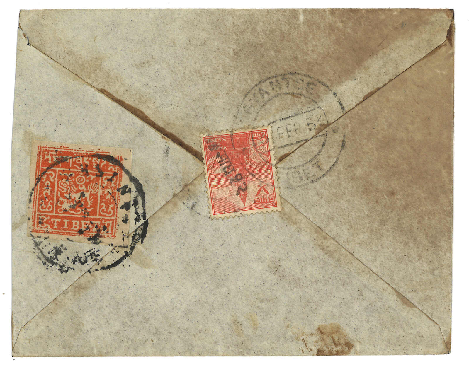 1954年一對由美國及奧國進口拉薩之封片,前者寄郵商Tuladhar,混貼西藏獅圖第二版票。後者鈐B9型彗星日戳。為西藏地方郵政及英印客郵局之晚期例子。(Image 1)
