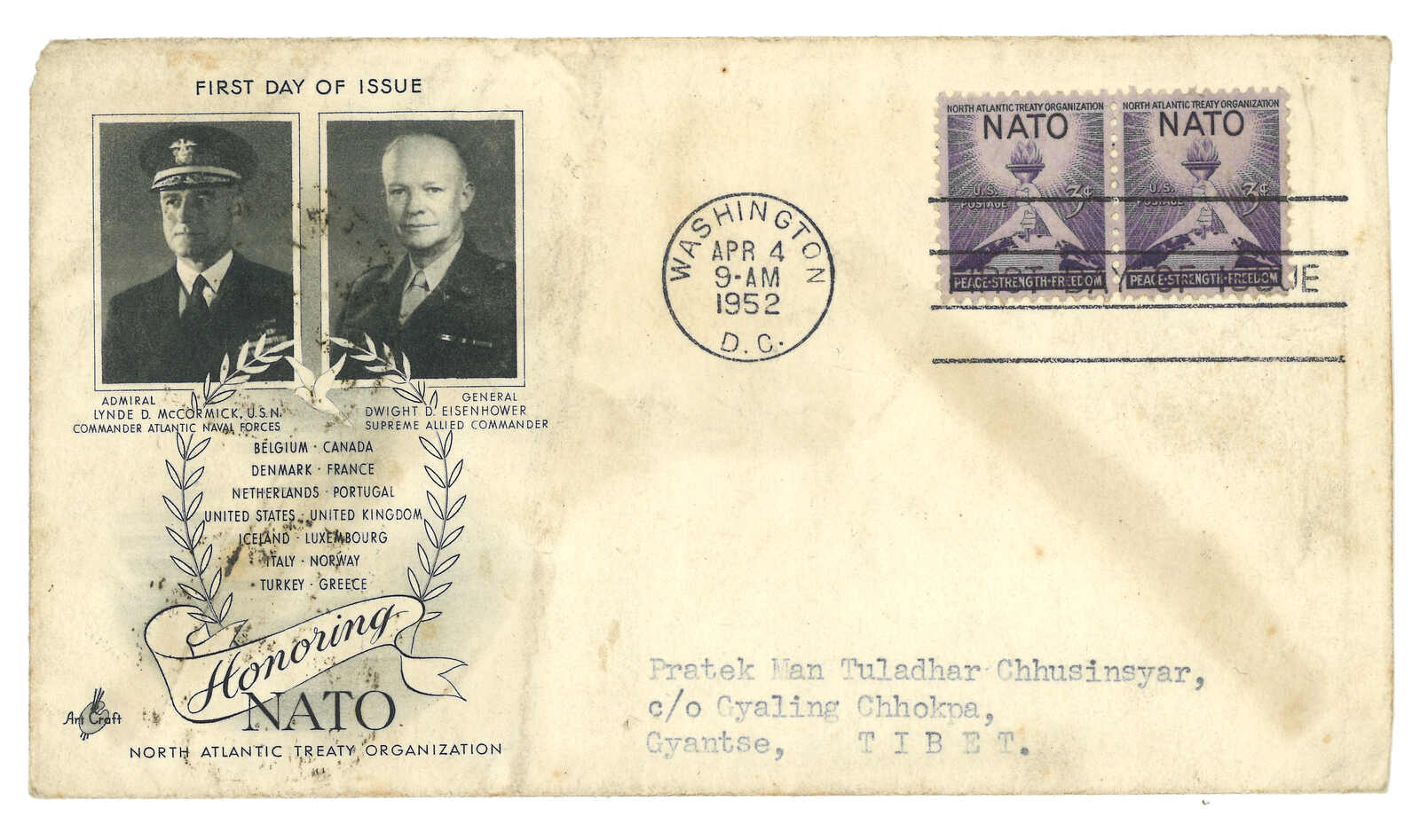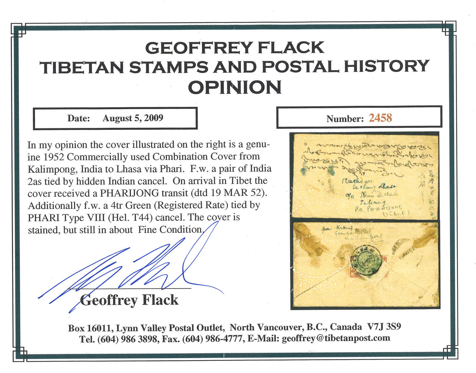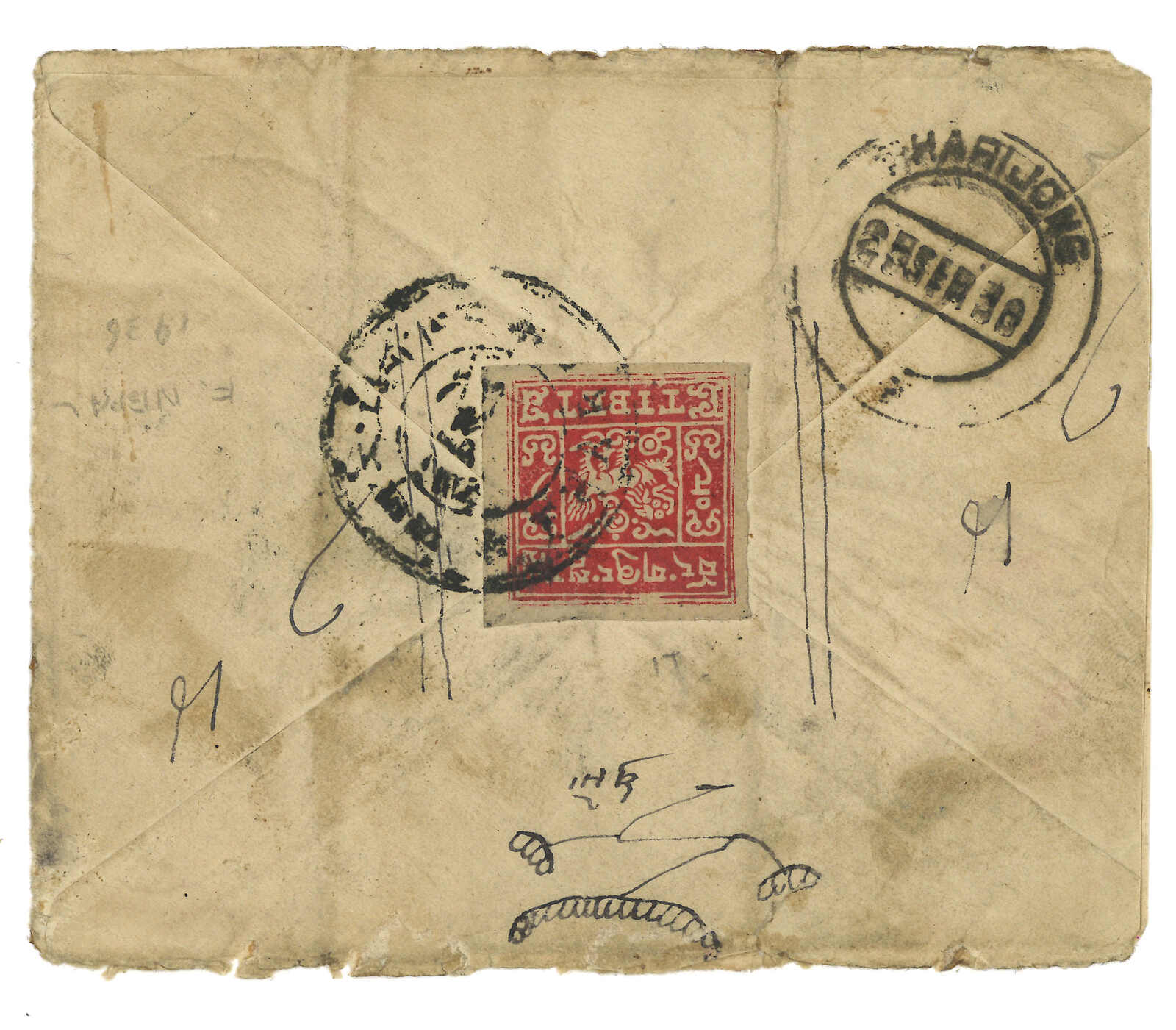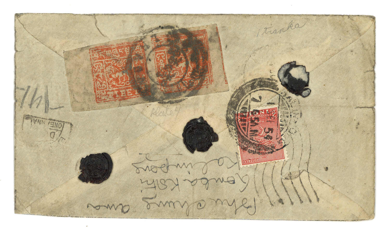 1954年一對由美國及奧國進口拉薩之封片,前者寄郵商Tuladhar,混貼西藏獅圖第二版票。後者鈐B9型彗星日戳。為西藏地方郵政及英印客郵局之晚期例子。(Image 1)