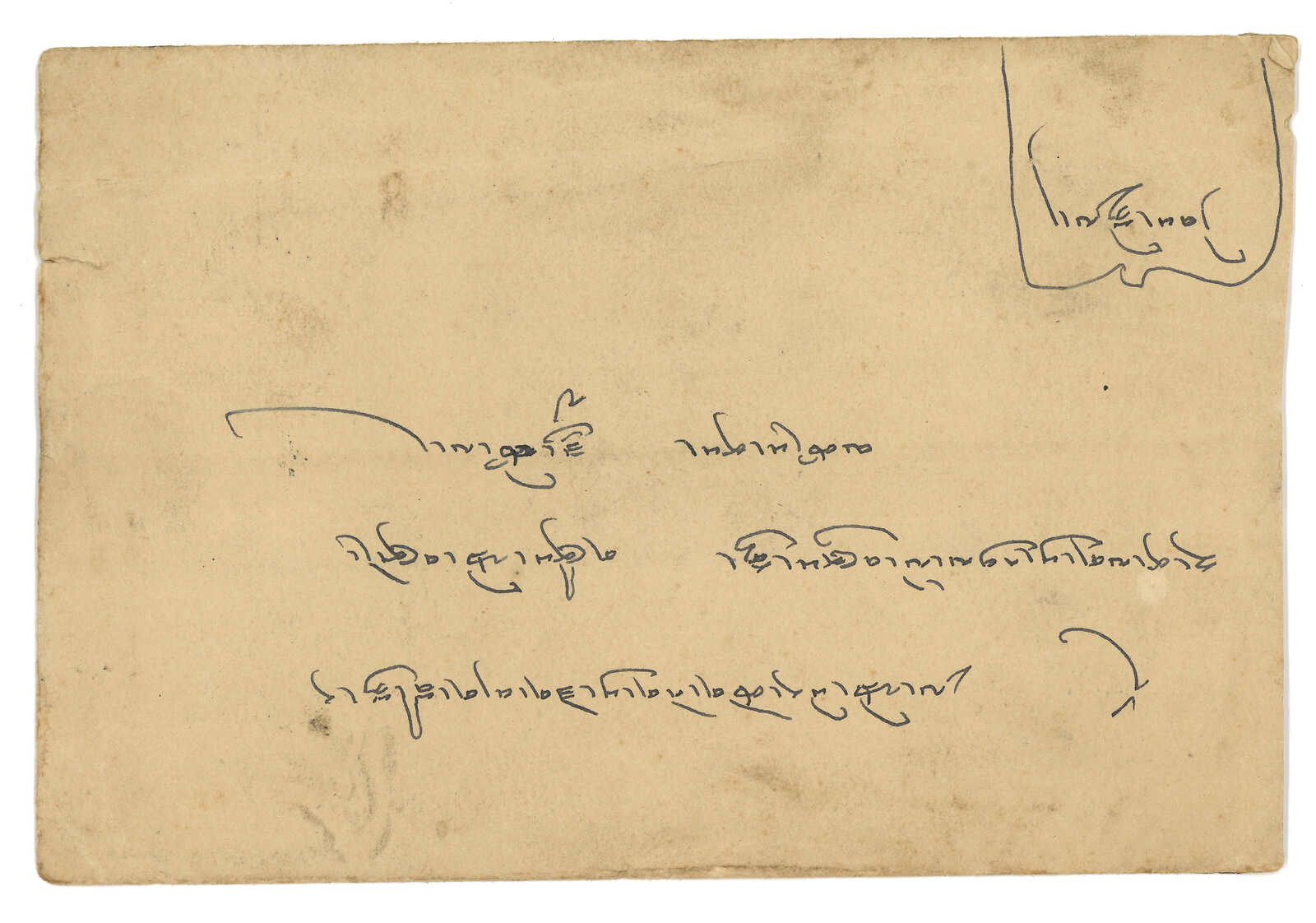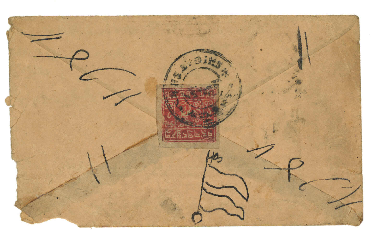 約1920年代拉薩寄江孜,背貼西藏獅圖第一版1/6章噶,銷拉薩I型陰文圓戳。經曲水、白地、浪卡子,均鈐I型陰文中轉戳,並手寫日期。郵戳稀罕難得,帶手寫日期者更是可遇不可求。(Image 1)