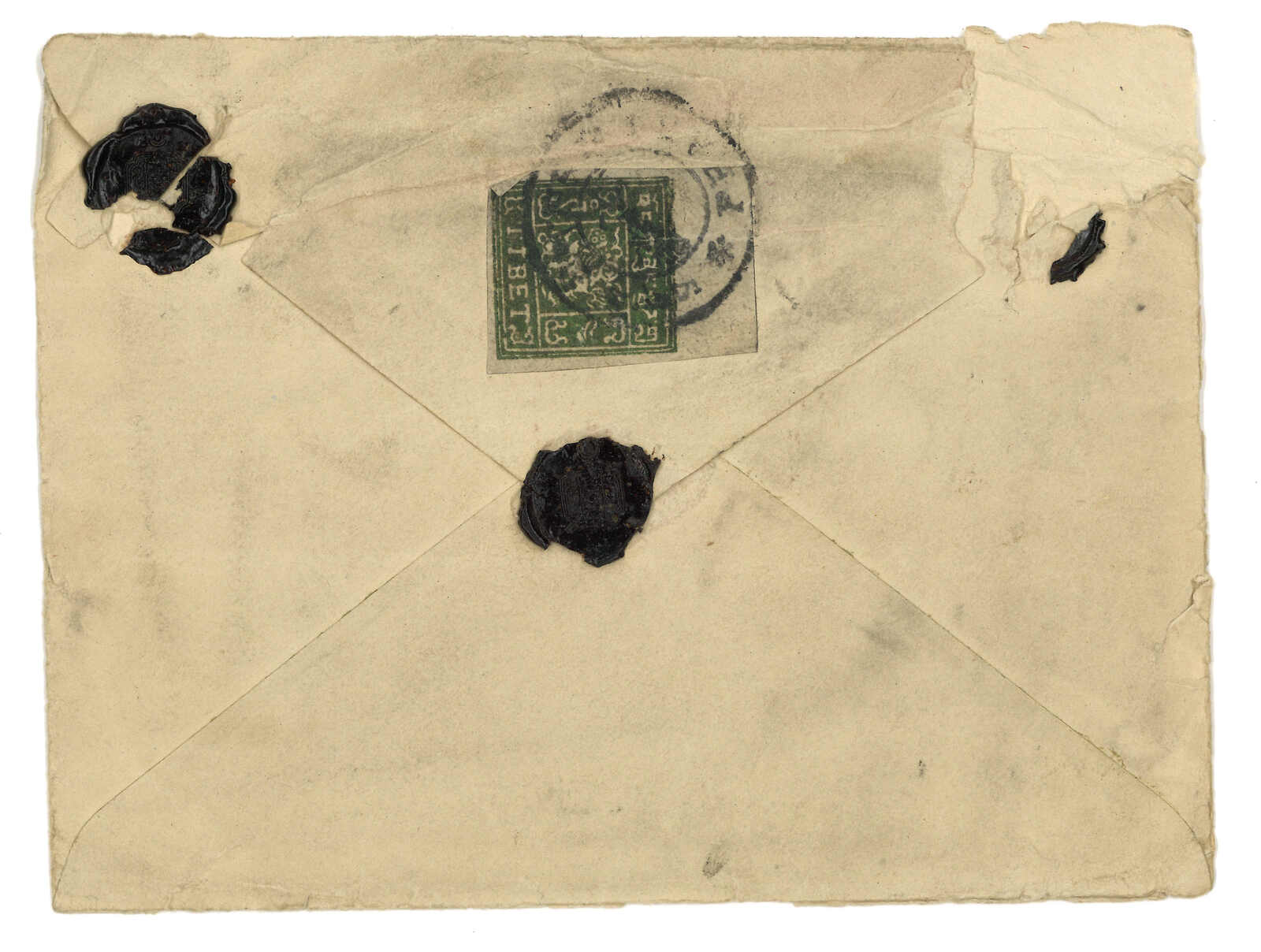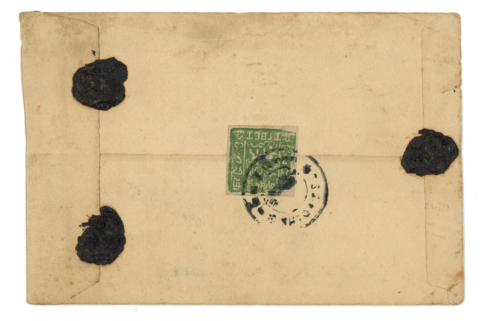 約1910年代日喀則寄拉薩,背貼西藏獅圖第一版1/6章,銷日喀則圓戳。經白朗、江孜、白地。出自這些西藏小地名之郵戳尤其少見。封剖開以作展示。(Image 1)