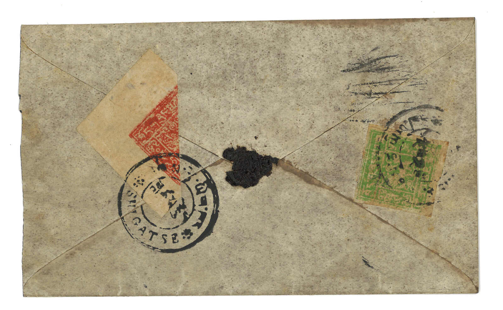 ca 1910s Shigatse to Lhasa, f.w. Tibet 1st issue 1/6tr on reverse, tied by Shigatse circular h.s. Transit Penam, Gyantse, Pelti. Cancellations from the Tibetan small towns are scarce. Cover opened out for display.