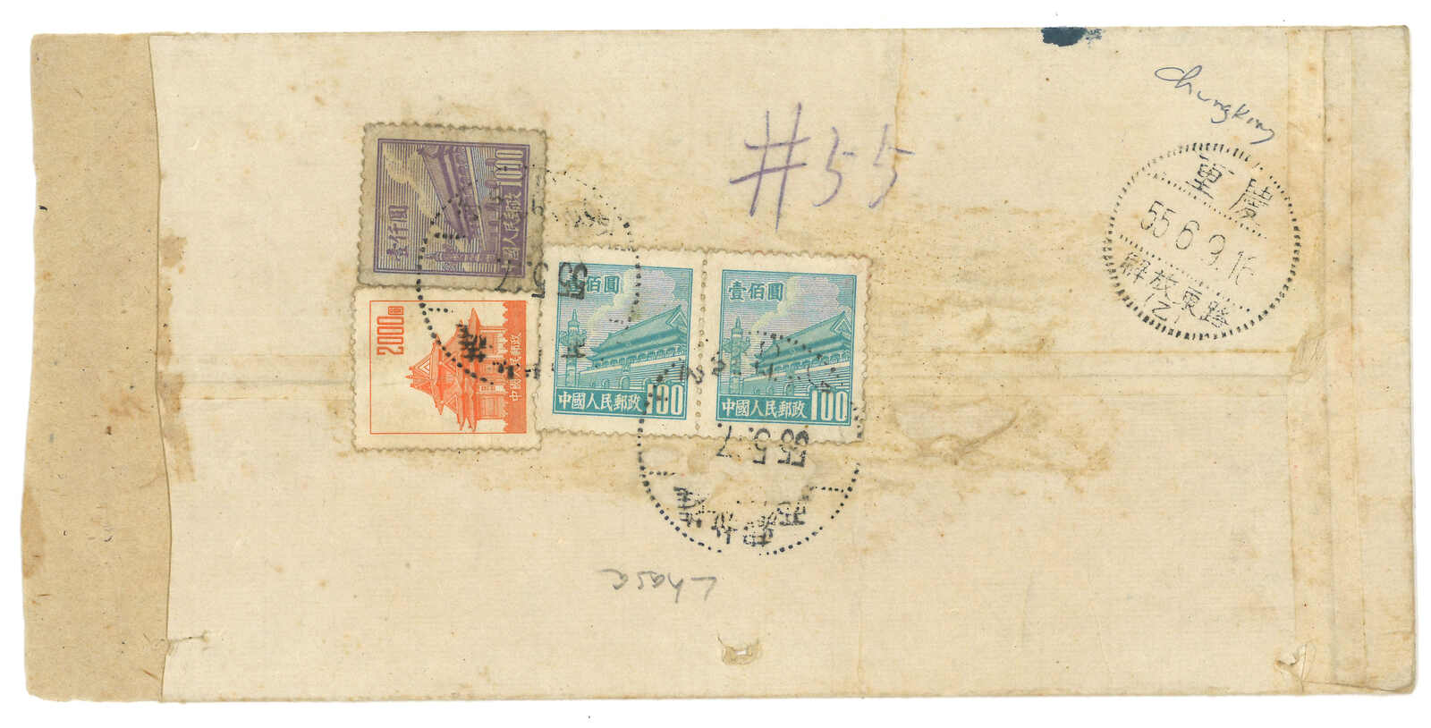 1955.5.7 拉薩寄重慶。中式封,背貼普票100元雙連 + 1000元 + 2000元,合國內雙掛號郵資(新人民幣3角2分),銷“西藏拉薩”漢文藏文T4型點線日戳。6.9抵重慶。(Image 1)