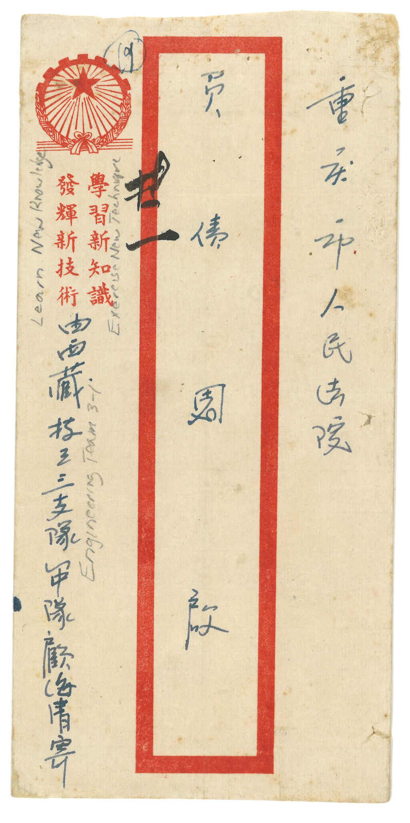 1955 Lhasa (7 May) to Chungking. Chinese style cover, f.w. R series issue $100 in pair + $1000 + $2000 on reverse for domestic double registered rate (New RMB 32c), tied by "Tibet Lhasa" type T4 Chinese-Tibetan bilingual cds.