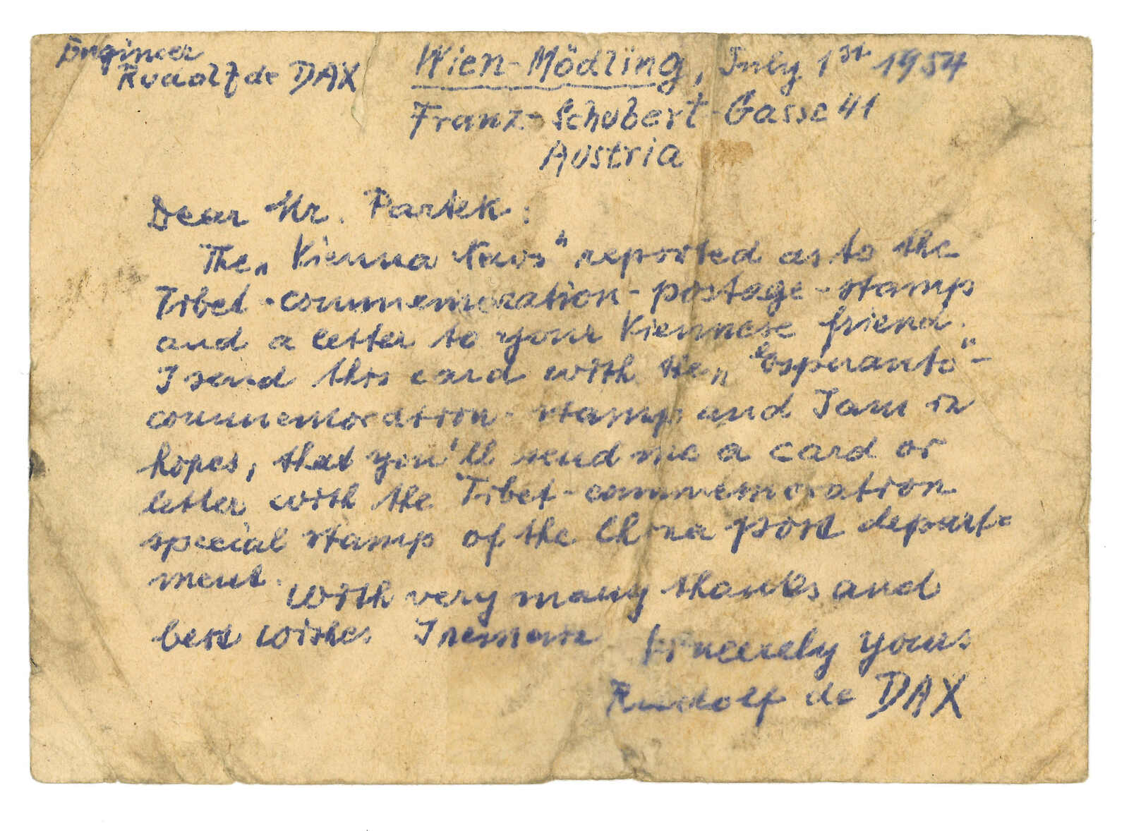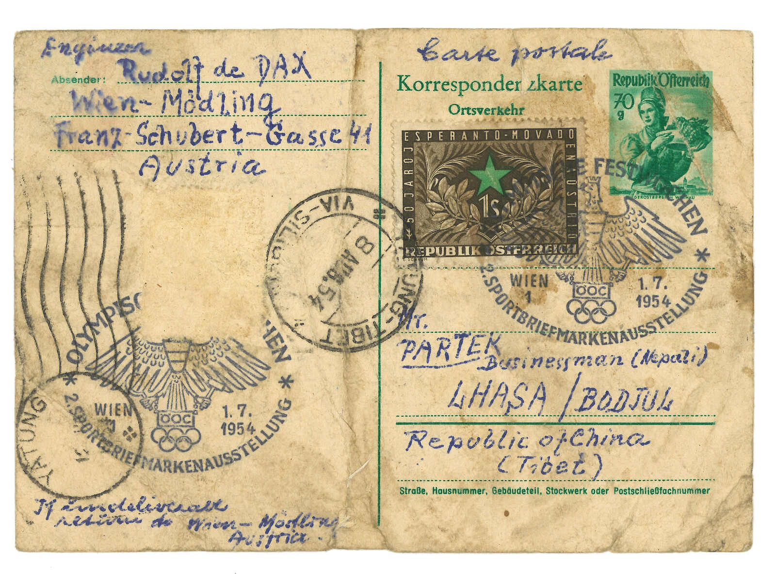 1954 a pair of incoming cover and postcard from USA and Austria to Lhas. Former addressing to stamp dealer Tuladhar and in combination with Tibet 3rd issue. Latter applied with type B9 comet d.s. Late example of Tibet local