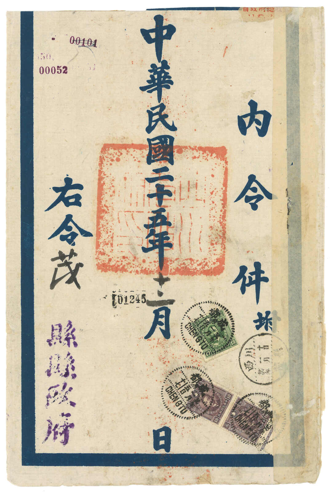 1937.1.5 成都經阿壩寄茂縣。大型公文封,貼烈士1角雙連 + 1角3分,銷成都三格點線日戳。1.10抵茂縣。(Image 1)