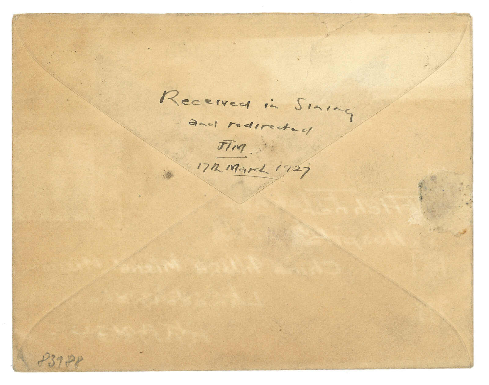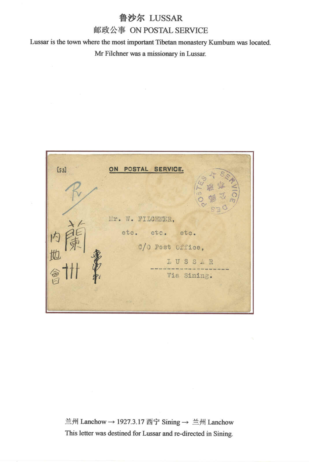 1929 (8 Aug) On Service "Test Cover" from Shanghai to Labrang, Kansu, frnakless, applied with Shensi and Kansuu Postal Commissioner handfilled d.s. Arrived Labrang (24 Sep). Returned to Shanghai via Lanchow (20 Feb). In 1929,