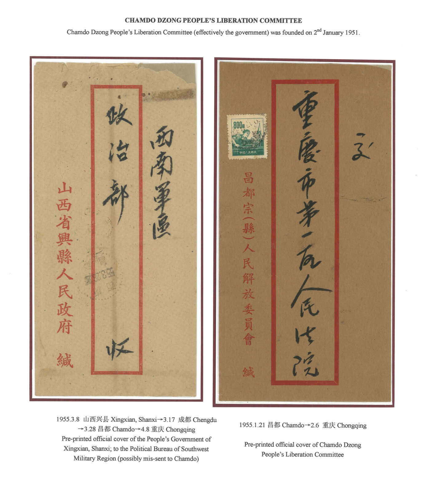 1955 a pair of domestic covers from / via Chamdo, both f.w. R series issues $80, both applied with "Sikiang / Chamdo" cds. In Jul 1955, the province of Sikiang was dissolved.