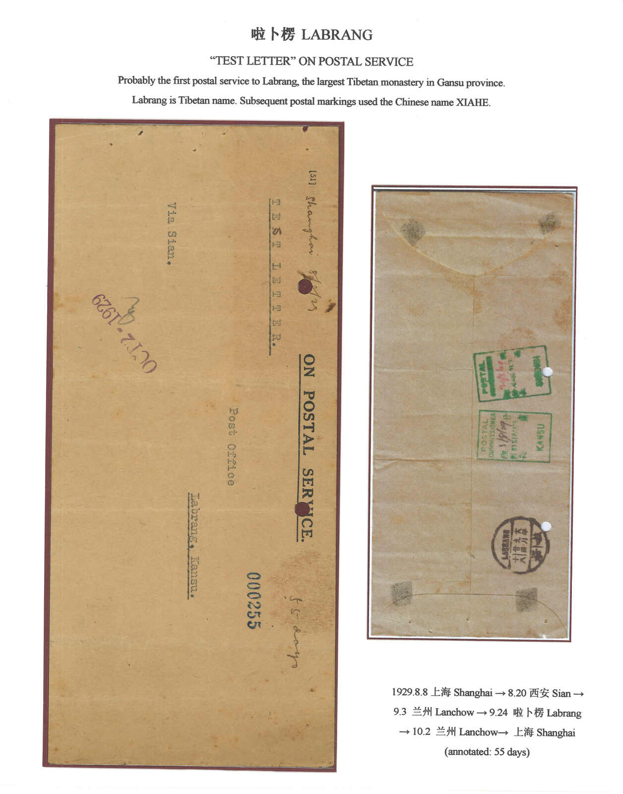 上海至啦卜楞郵路試驗封,背鈐陝西及甘肅郵務長手填日戳。9.24抵啦卜楞。後2.20經蘭州回到上海。1929年青海建省,但由於馬家軍與拉卜楞寺積怨甚深,故後者留於甘肅。此可能為拉卜楞最早之郵例。(Image 1)