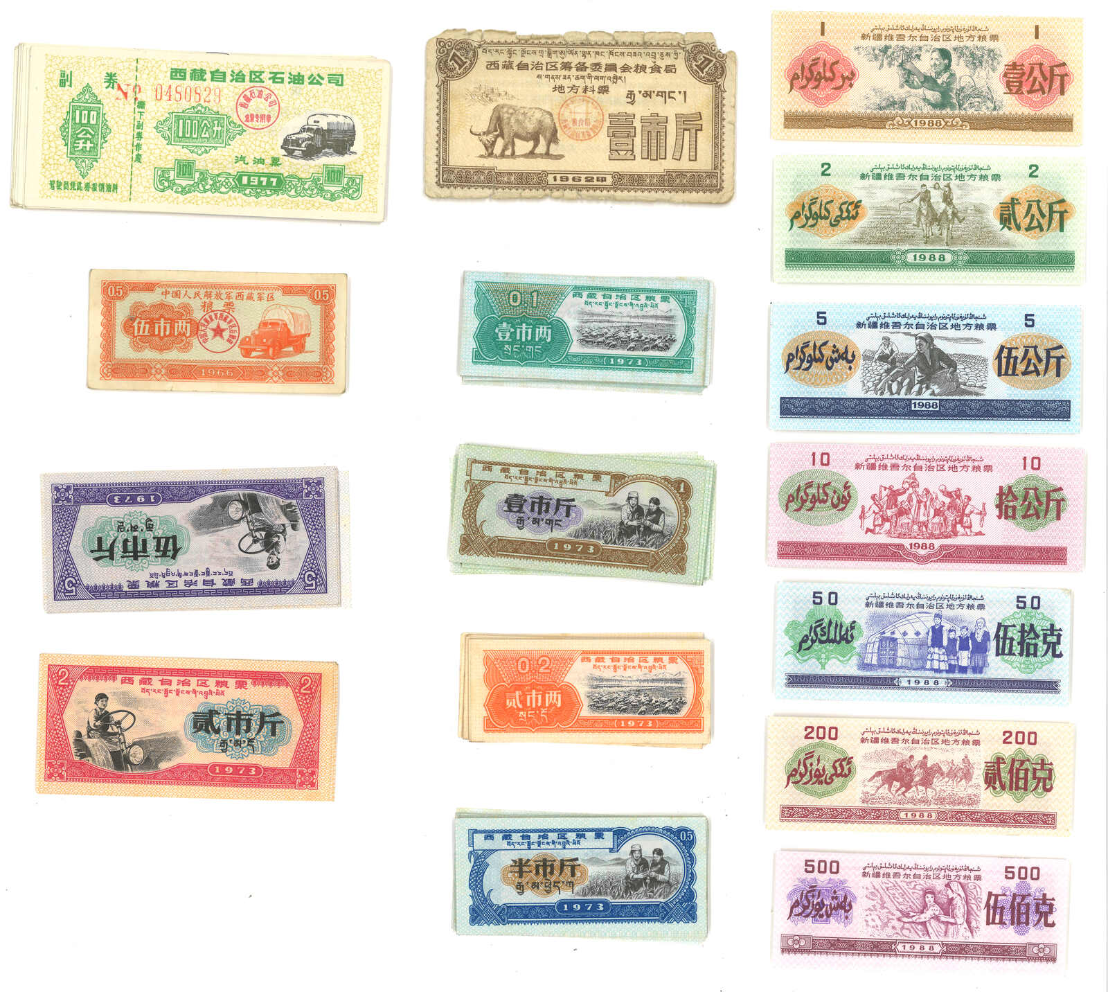 1970年代一組數百張西藏糧票、煤油票、電票等。(Image