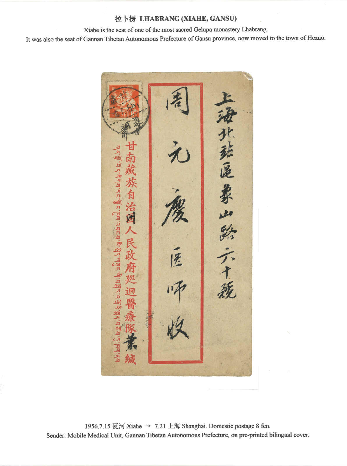 1956.7.15 甘南藏族自治區巡迴醫療隊封,寄上海,貼普8冶金工人8分,銷“甘肅 / 夏河”三格點線日戳。7.21抵上海。為甘肅藏區之例子。拉卜楞寺(夏河)於青海建省時未有加入,而是留於甘肅。在解放後成立甘南藏族自治區。(Image 1) (Image 2)