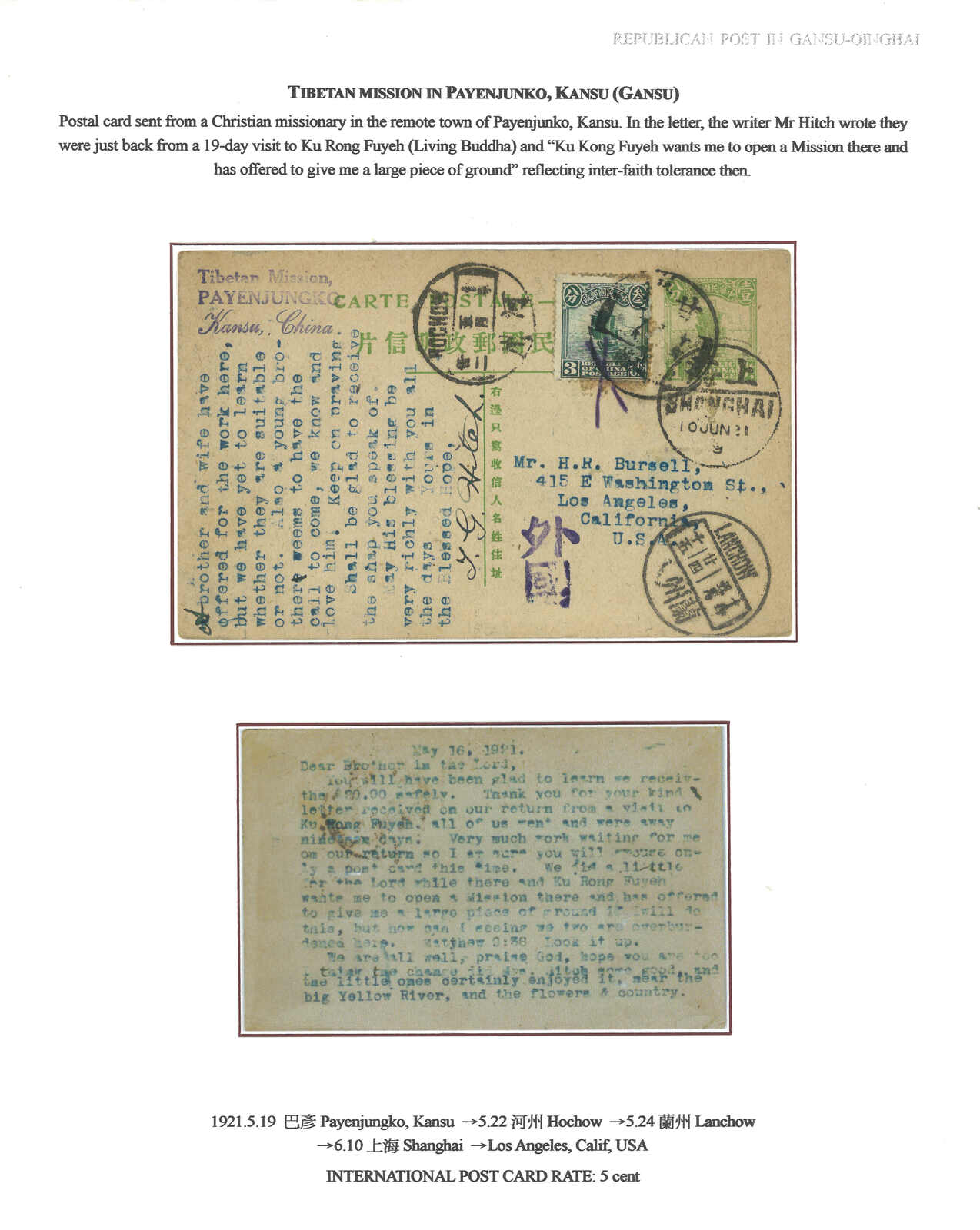 1267 cover image1921 Payenjungko (19 May) to USA, Junk 1st print 1c PSC, uprated by 3c, tied by Kansu Payenjungko cds. Transit Hochow (22 May), Lanchow (24 May), Shanghai (10 Jun). Very scarce outgoing staionery card from this remote town in Kansu.