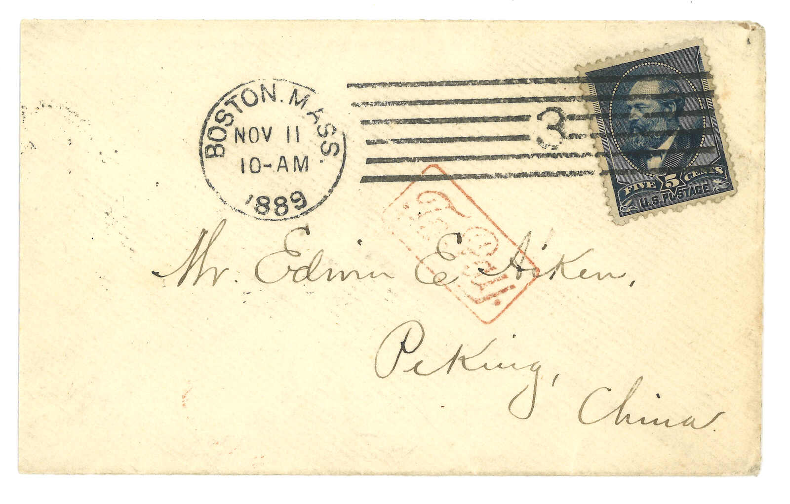 1889年11月11日,一封貼有美國5分深藍色郵票的信封,寄給駐華傳教士 Edwin E. Aiken 先生(Edwin Aiken 為來華四年之公理會教士,積極從事教育及傳教工作),信封銷有**“BOSTON, MASS, NOV 11, 1889 日戳**,並施以六線長條"3" 數字取消戳。信封正面另蓋有紅色框線“TO PAY”欠資戳。背面則蓋有多個重要轉遞郵戳,包括: