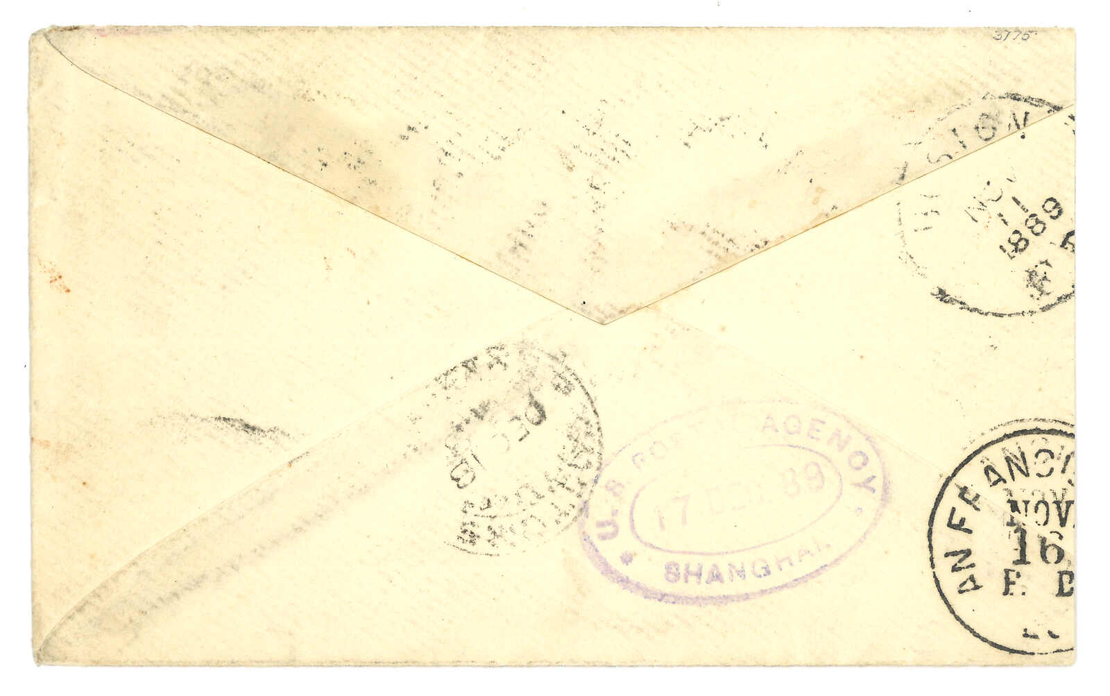 紫色橢圓戳“U. S. POSTAL AGENCY / SHANGHAI / 17 DEC89”(美國駐上海郵政代理局)