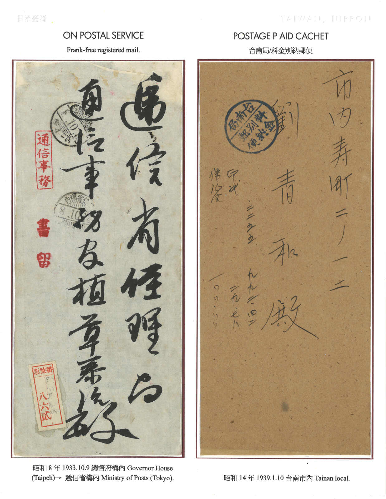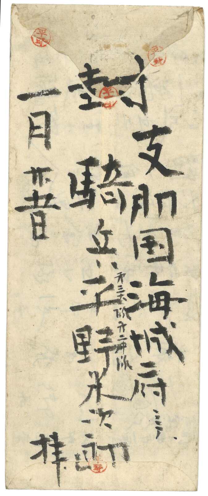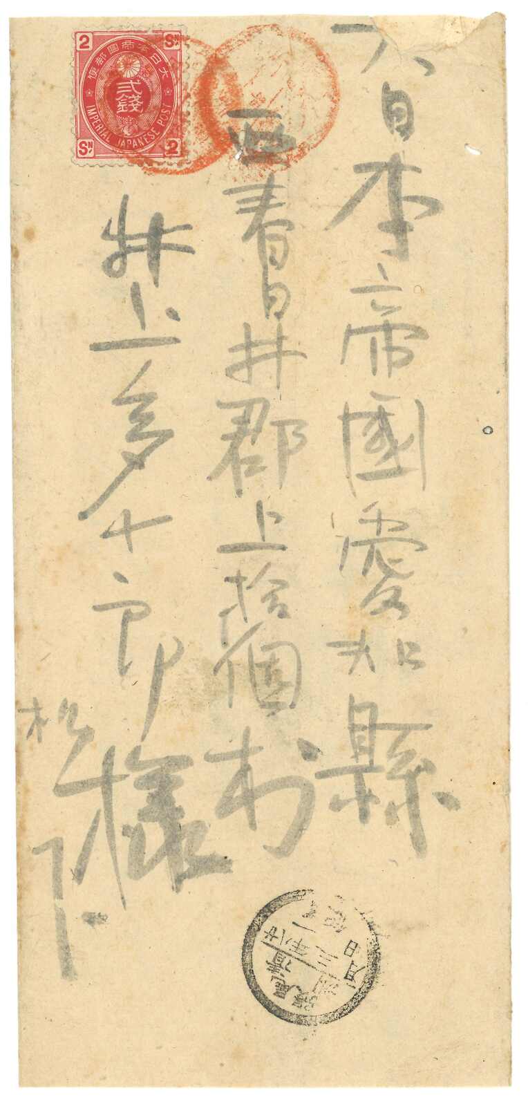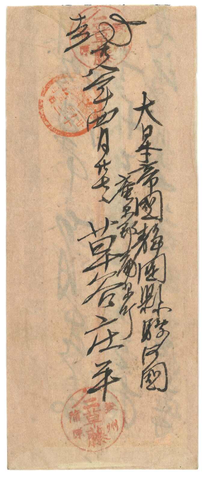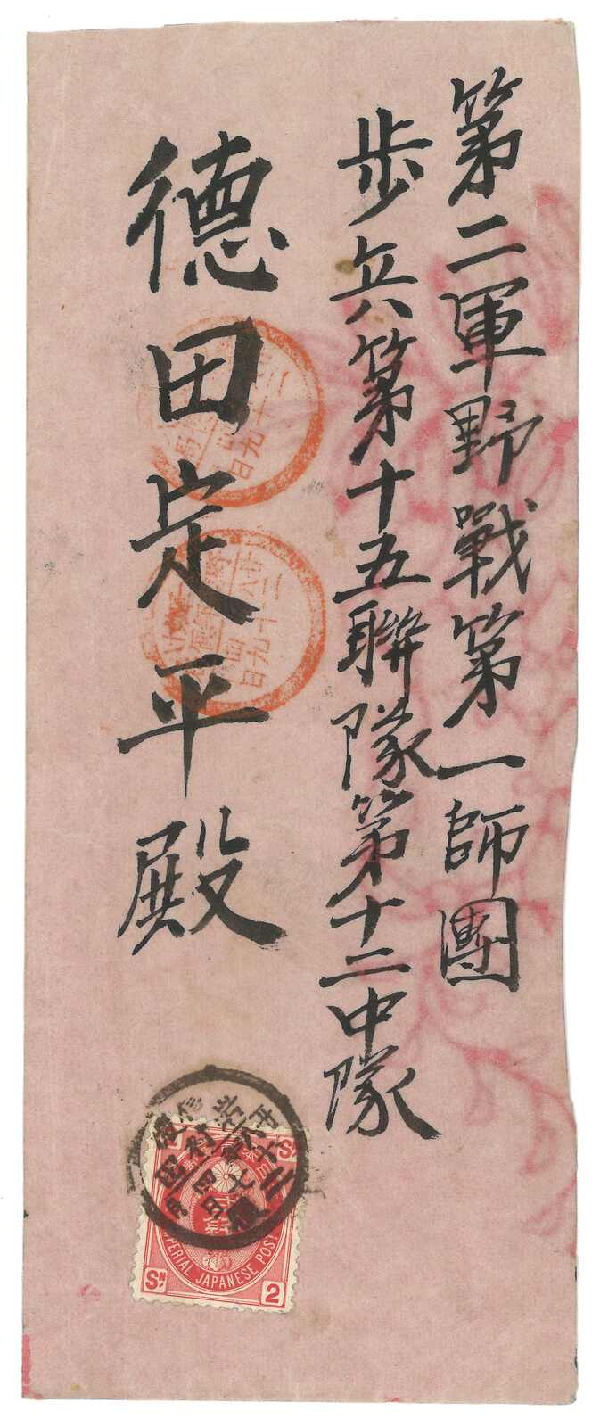 1895至1896年一對寄自威海衛之日本軍郵封,分別鈐少見之“威海衛第一郵便局”黑色及紅色日戳。(Image 1) (Image 2) (Image 3) (Image 4) (Image 5)