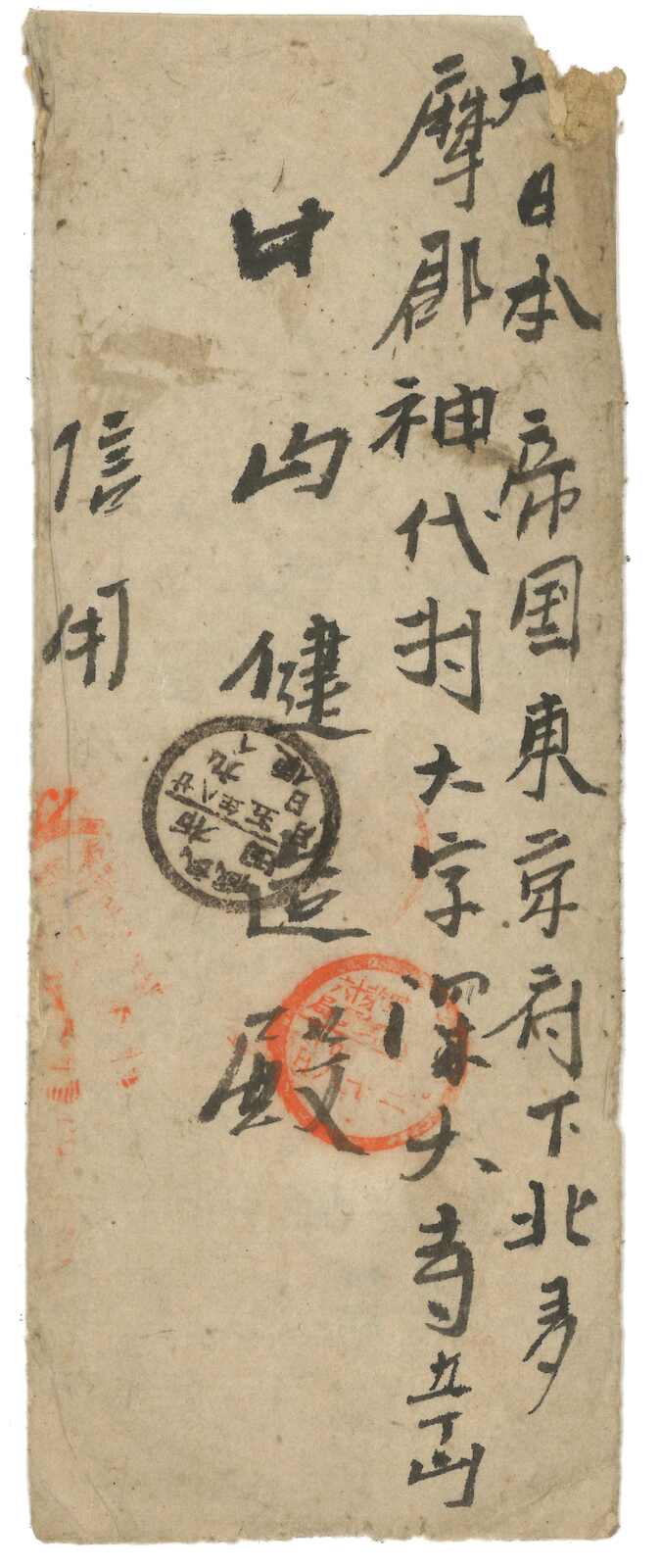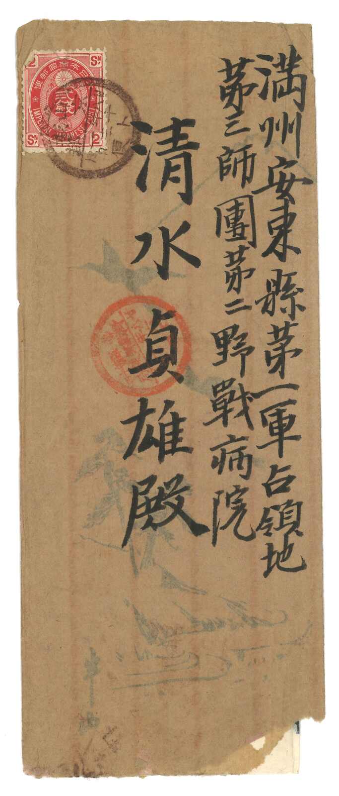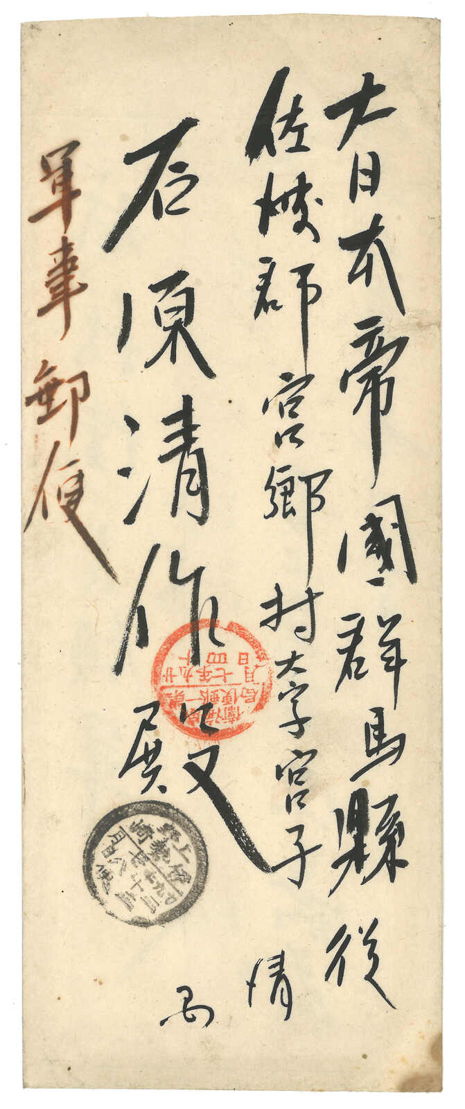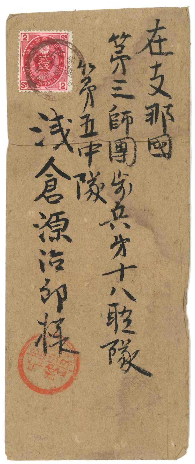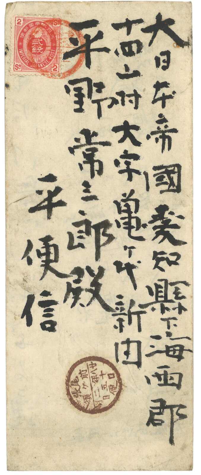 1895至1896年一對寄自威海衛之日本軍郵封,分別鈐少見之“威海衛第一郵便局”黑色及紅色日戳。(Image 1) (Image 2) (Image 3) (Image 4) (Image 5)