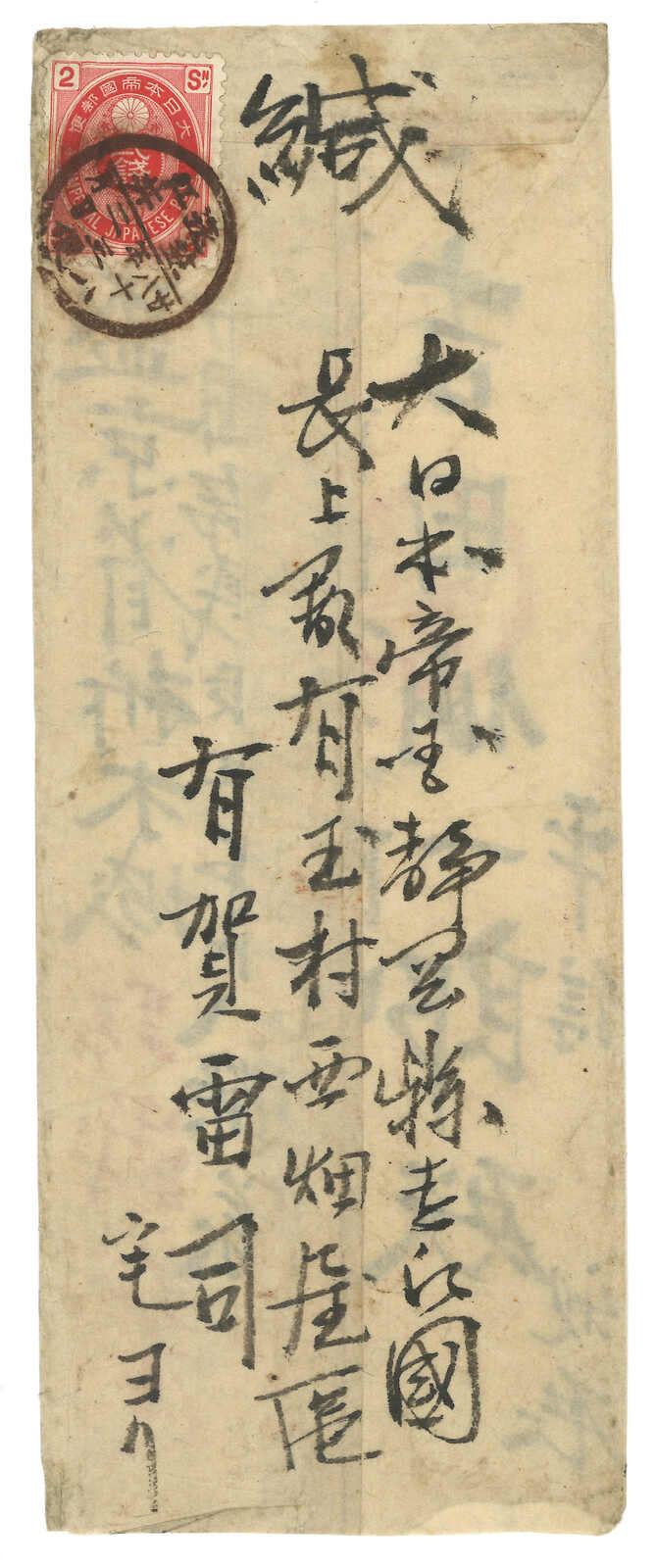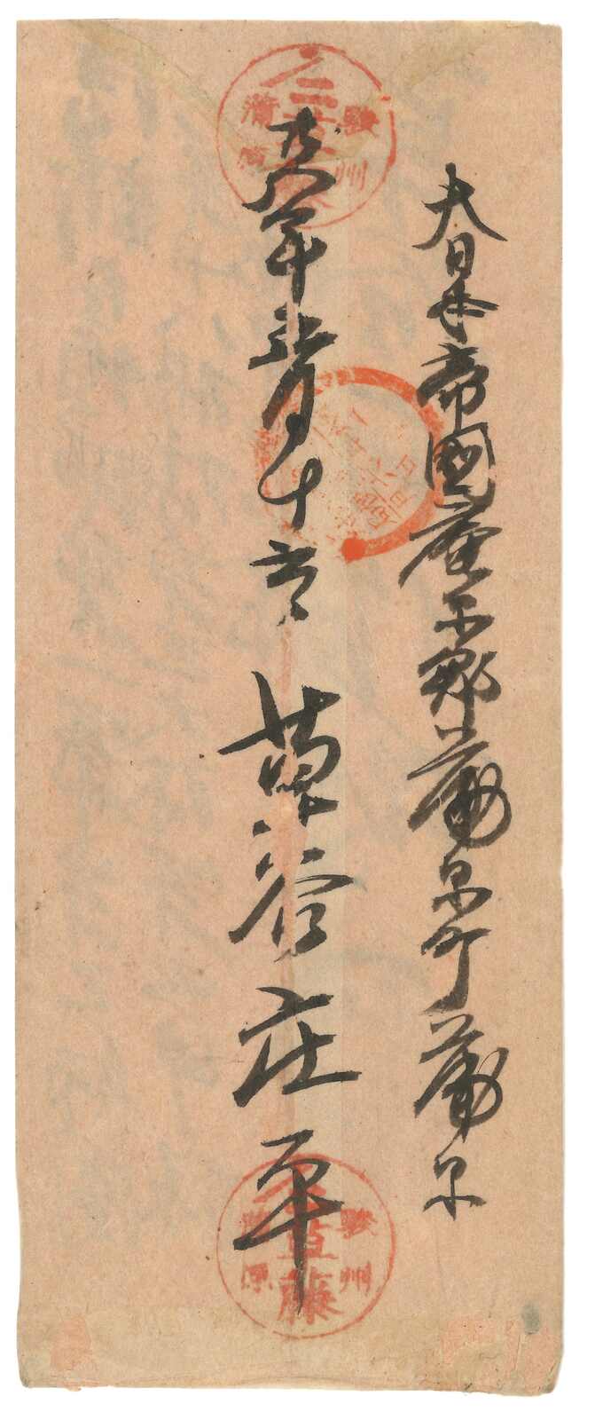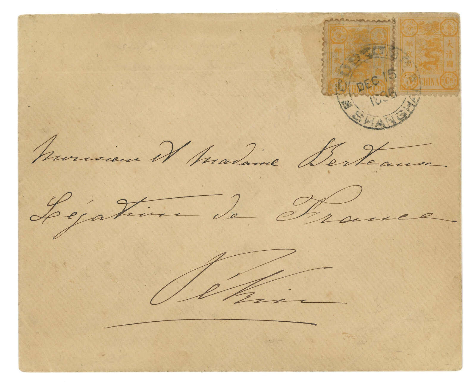 74 cover image1896 Shanghai (15 Dec) to Peking via winter route, f.w. Empress Dowager first print 3ca x2, tied by Customs Shanghai cds. Arrived Peking (4 Jan).