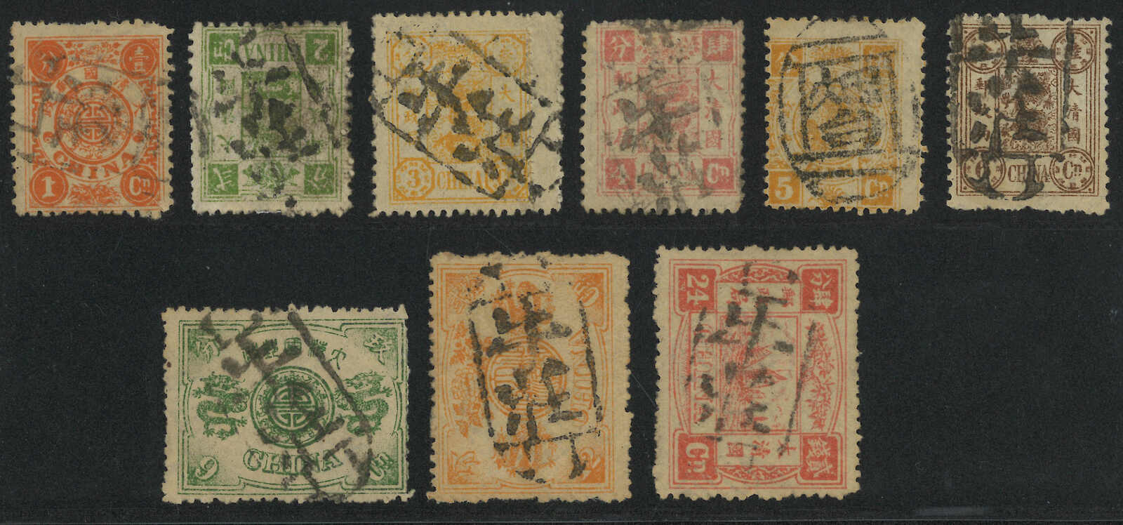 71 o image1894 Empress Dowager first printing 1ca to 24ca, cancelled by Chefoo seals, fine to very fine strikes, the 12ca discolored. Chan 22-30.