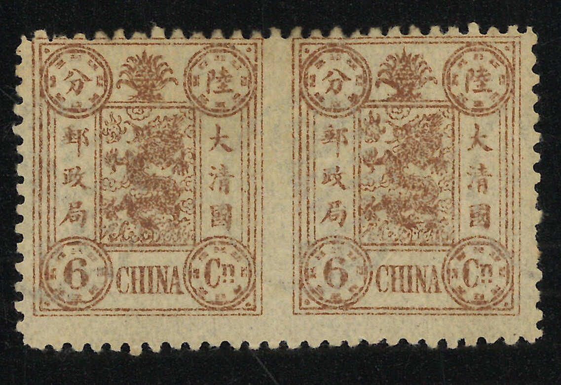 1894年6分銀橫雙連,慈壽初版,中縫漏齒。新票背貼,上品。漏齒變異之雙連記錄中僅見少於十件,極為難得。(Image 1) (Image 2)