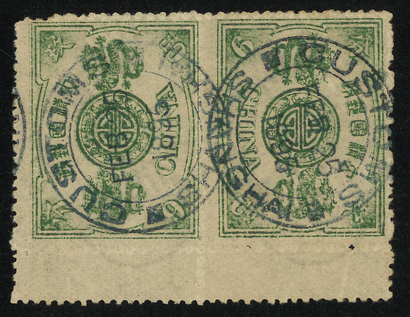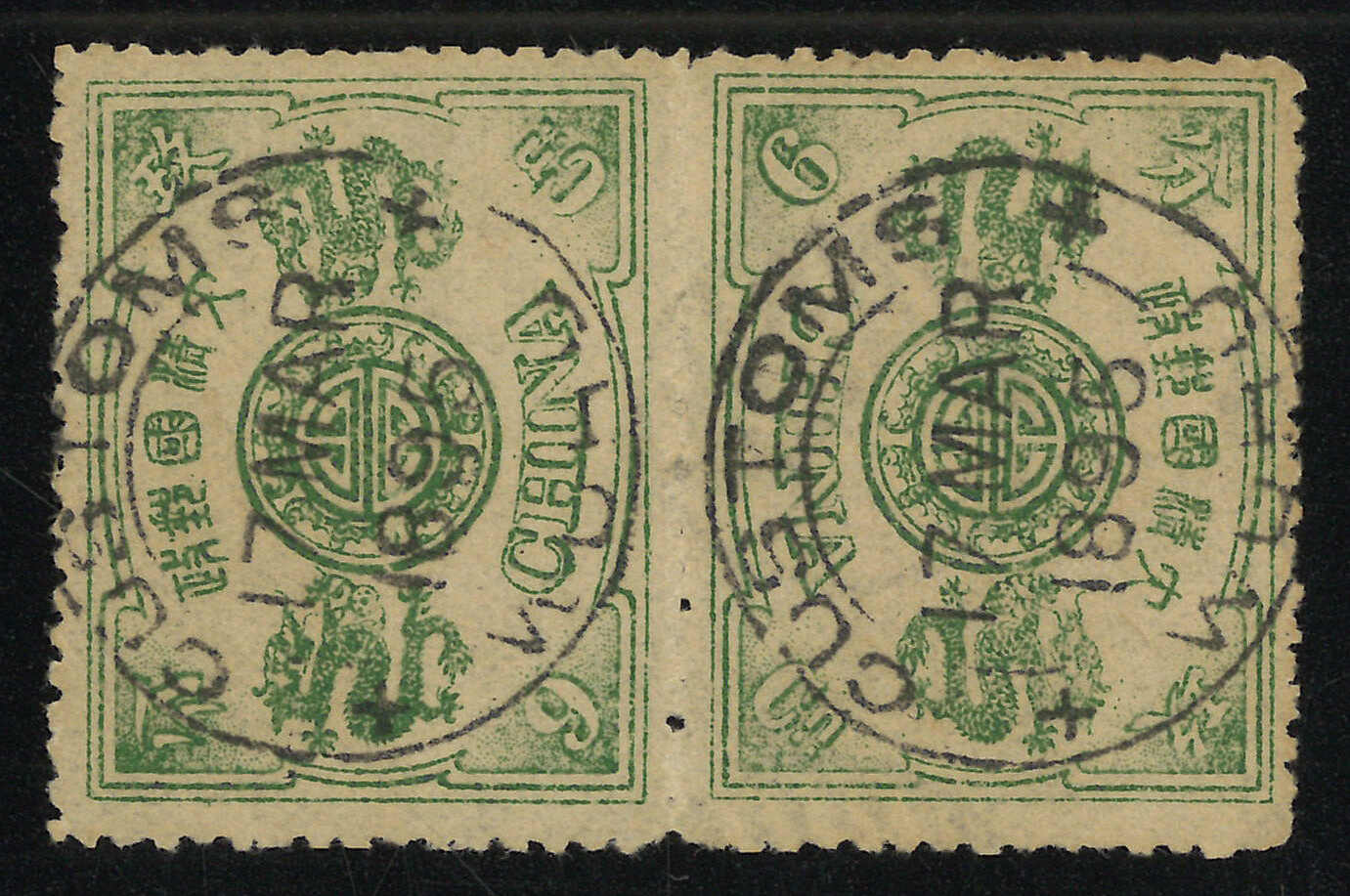 1894年9分銀對倒直雙連,慈壽初版(陳目28g),帶左邊紙,銷上海海關1895年2月25日日戳。出自第二盤格。色彩鮮艷,上品。(Image 1) (Image 2)