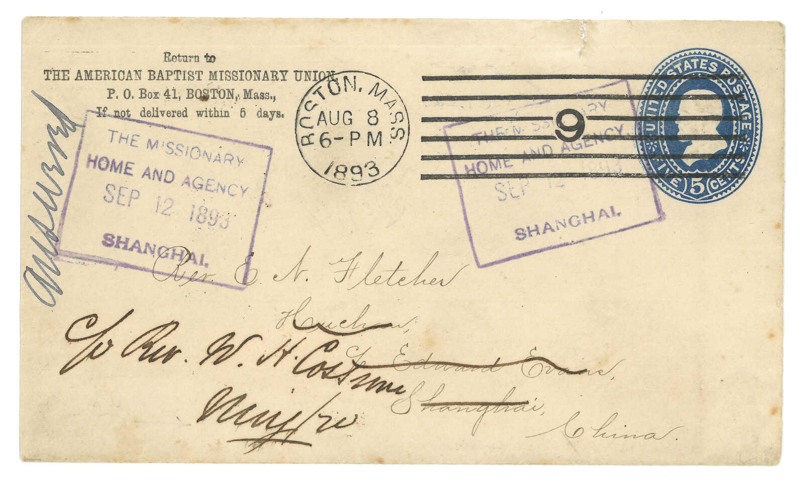 79 cover image1893 (9 Aug) US 5c stationery cover to Ningpo, applied with Boston machine d.s., matching cds on reverse. Transit San Francisco (14 Aug), USPA Shanghai (12 Sep), Shanghai LPO (12 Sep). Arrived Customs Ningpo (14 Sep) with cds in red. Spectacular incoming example jointly delivered by US Post, Shanghai local post and Customs Post.