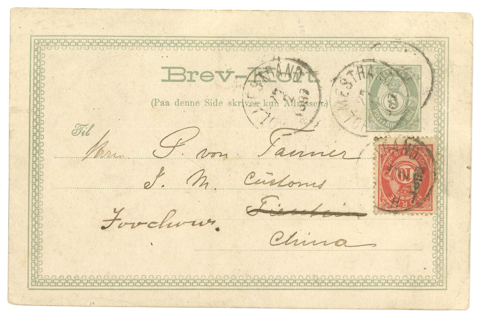 83 cover image1887 Norway (25 Feb) to Customs Tientsin, redirected to Foochow. Norwegian 5 ore PSC, uprated by 10 ore, tied by Holmestrand cds. Transit with Singapore-to-Hong Kong marine sorter (10 Mar), Customs Shanghai (10 Apr), Customs Tientsin (15 Apr) but redirected to Foochow via Customs Shanghai again (19 Apr). Very rare incoming example from Norway.