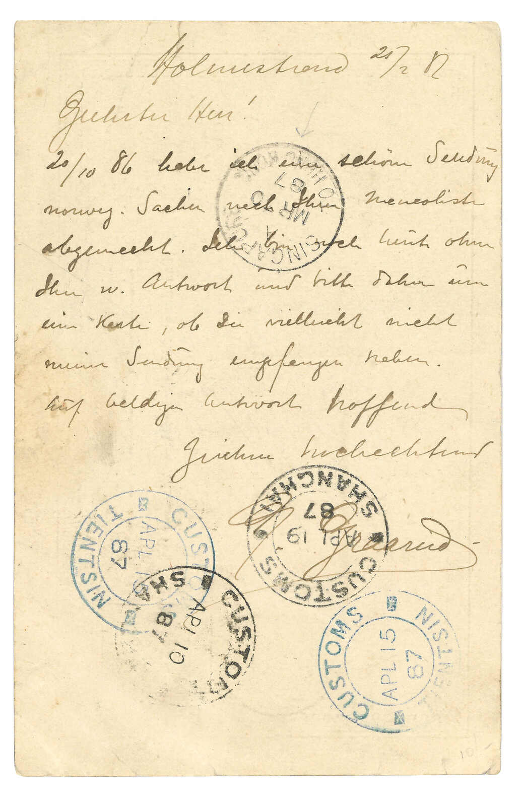 1887.2.25 挪威寄天津海關,改寄福州。挪威5歐爾郵資片,加貼10歐爾,銷Holmestrand日戳。3.10經新加坡至香港海上分揀。4.10經上海海關,4.15經天津海關,4.19再經上海海關改寄福州。非常少見難得之挪威進口例。(Image 1) (Image 2)