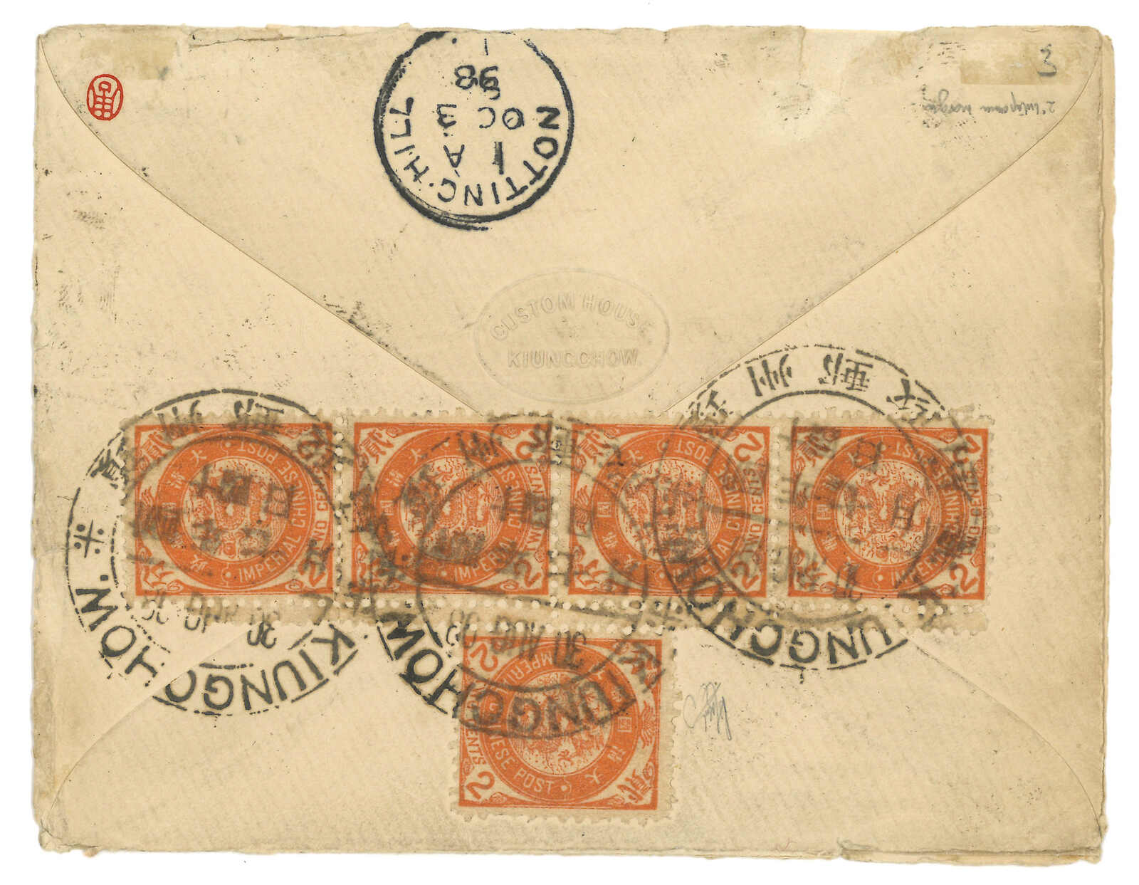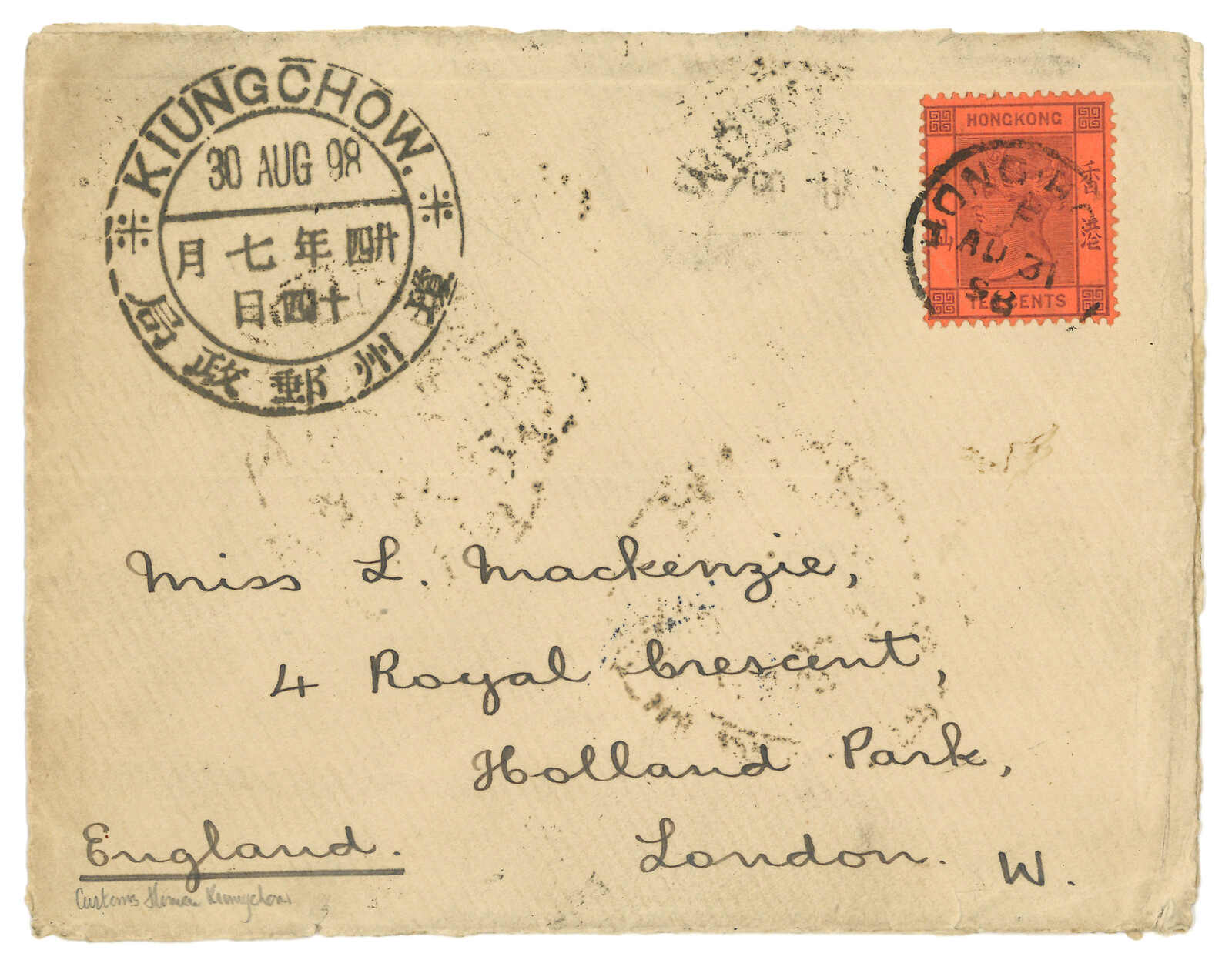 147 image1898 Customs Kiungchow (30 Aug) to England, f.w. Litho Dragon 2c x5 on reverse, tied by scarce Kiungchow Dollar cds. In combination with Hong Kong QV 10c, tied by Hong Kong (31 Aug) cds. Arrived Nottinghill (3 Oct). Scarce example of Kiungchow Dollar cds on Customs Kiungchow embossed cover.