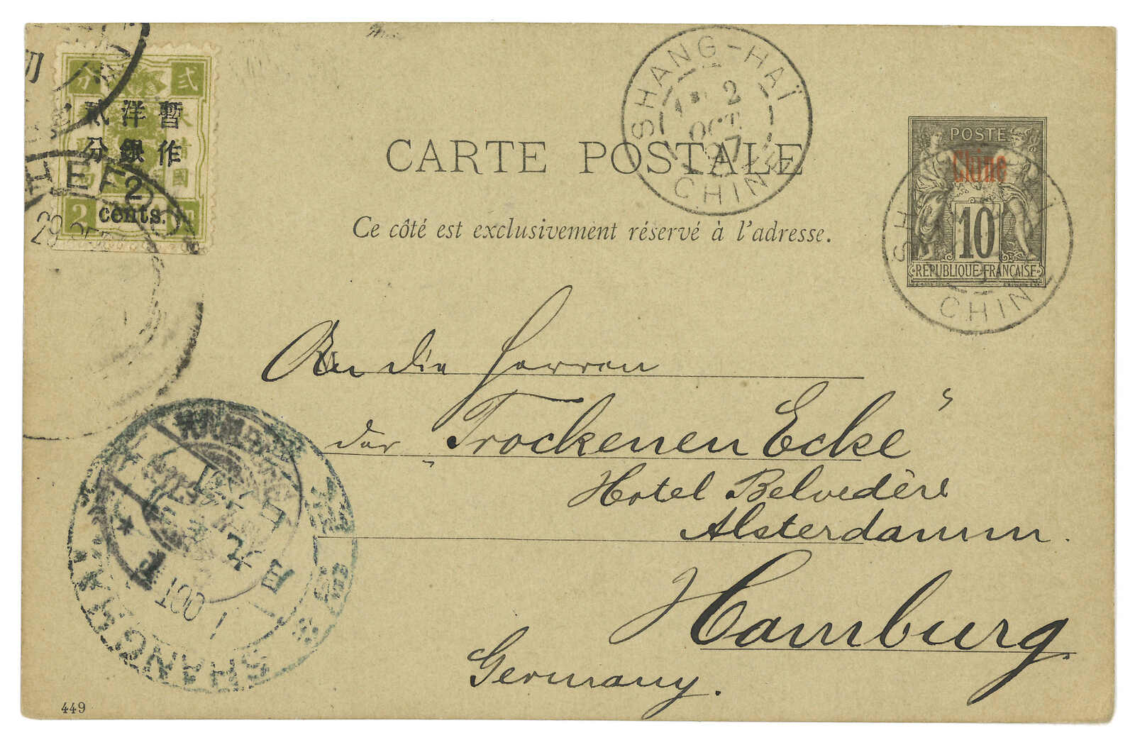 1897.9.29 煙台寄德國。法國加蓋Chine 10生丁郵資片,貼慈壽加蓋大字短距2分蓋2分銀,銷煙台大圓戳。10.1經上海,鈐大圓戳。郵資圖銷上海法局10.2日戳。抵漢堡。(Image 1) (Image 2)
