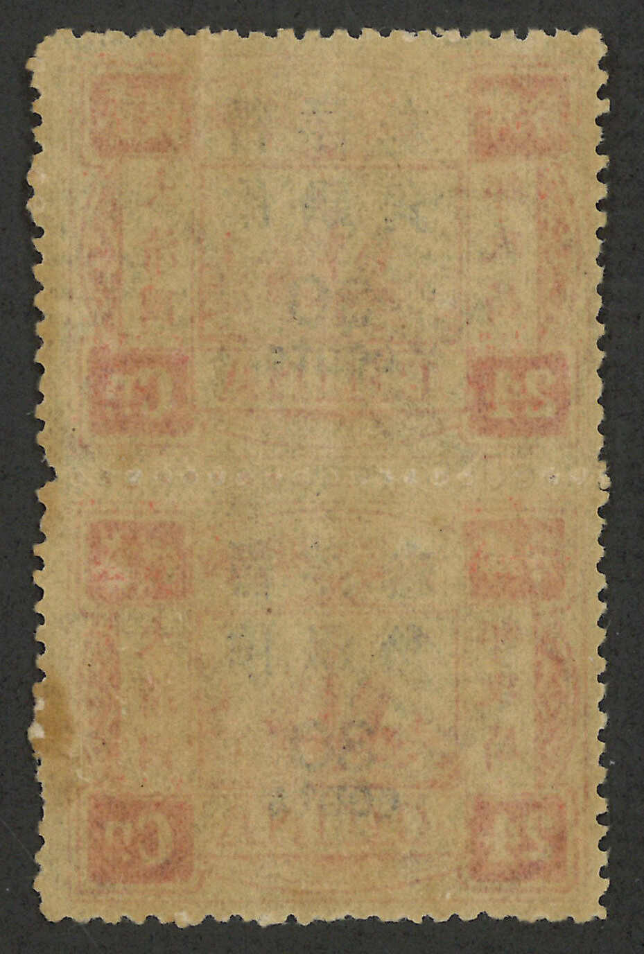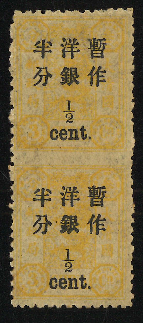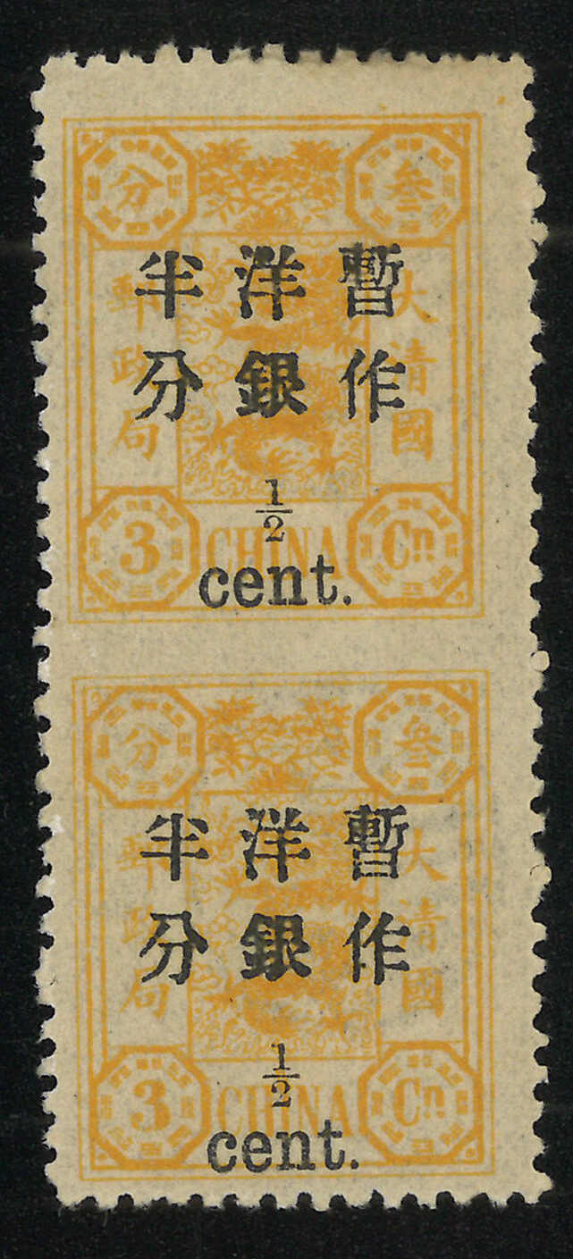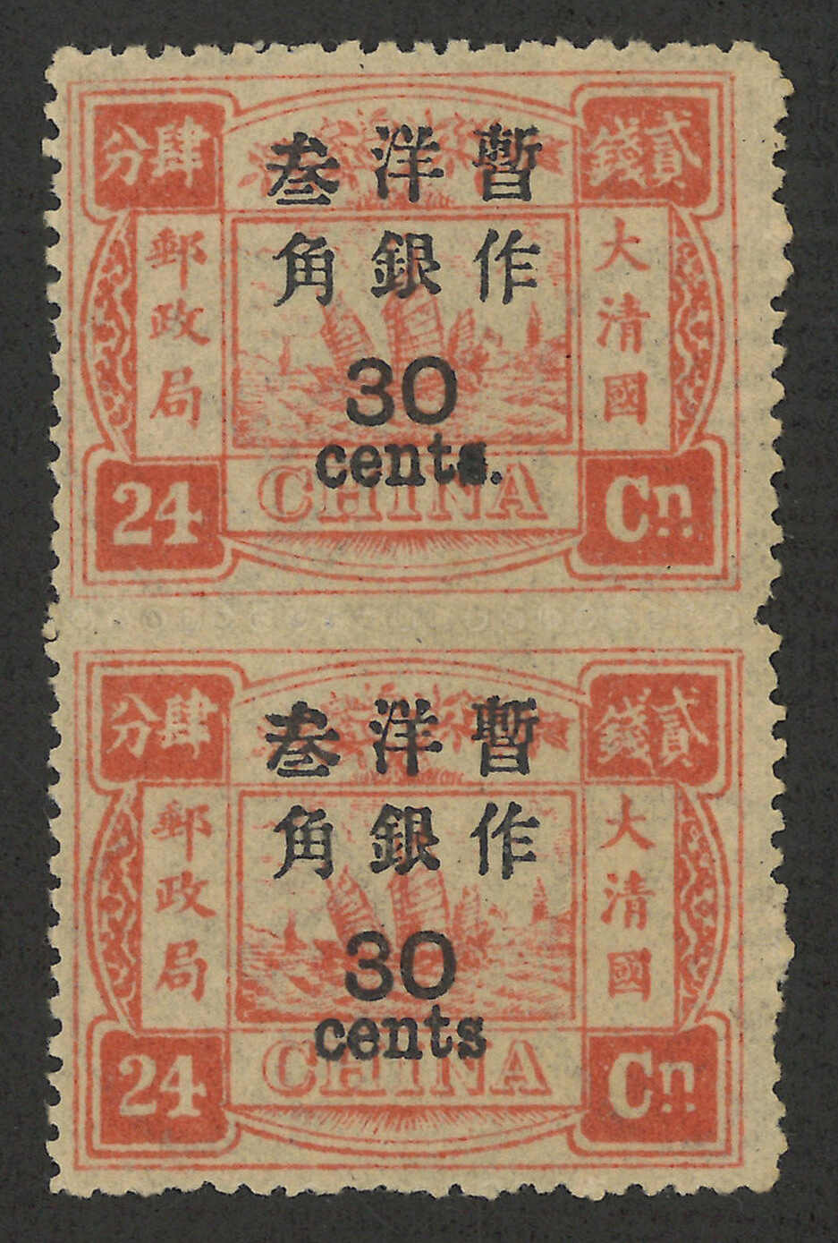 109 */pair image1897 Empress Dowager surch large figure 30c/24ca in vertical pair, with blind perf between variety. MLH with original.