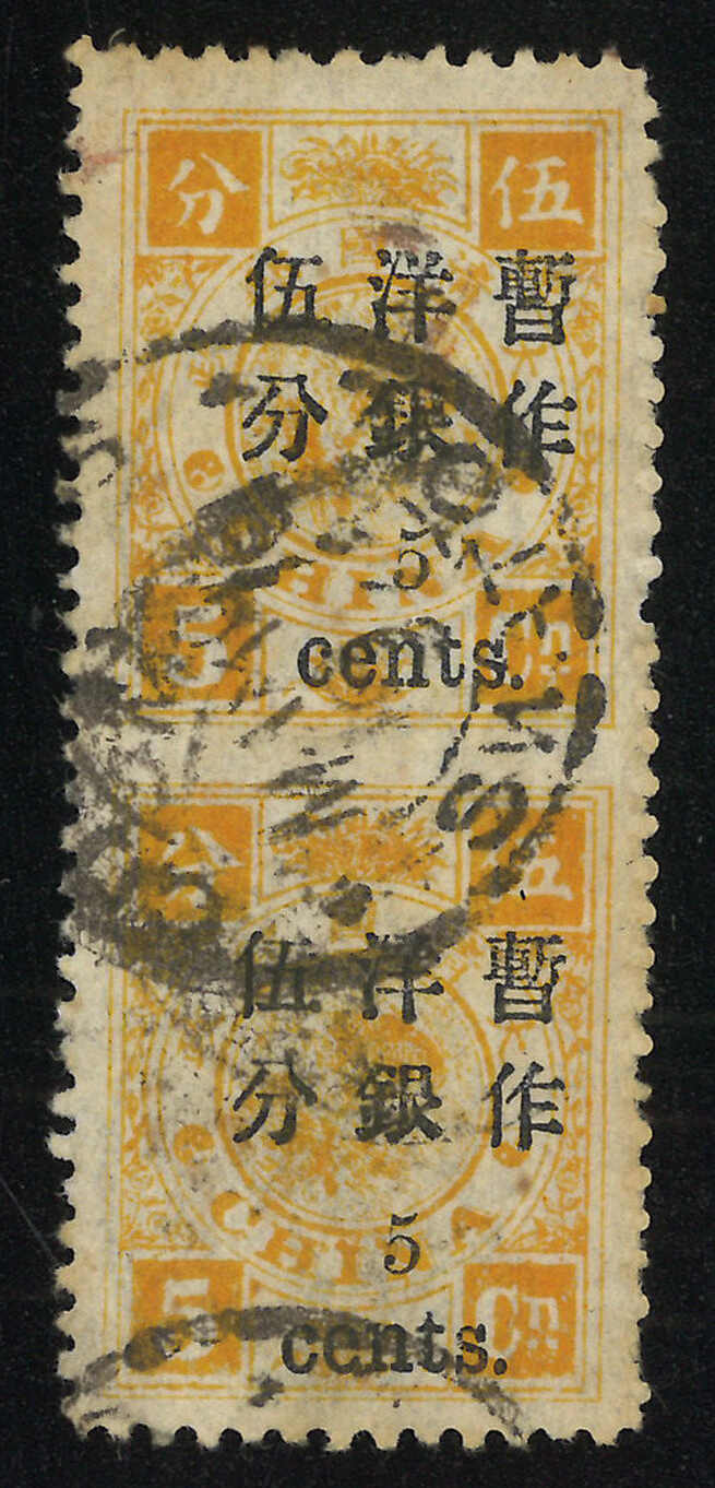 102 o/pair image1897 Empress Dowager small figure surcharges 5c on 5ca vertical pair, cancelled by "Customs / Swatow" dater. Approximately ten horizontal imperforate between pairs are known to date. A rarity.