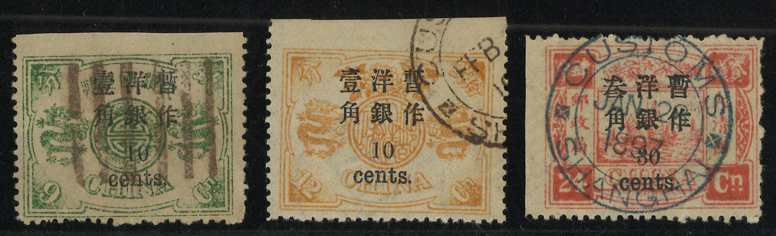 103 o image1897 Empress Dowager small figures surcharges 10c on 9ca, 10c on 12ca, and 30c on 24ca., each with imperf.margin on one side, cancelled by pakua or Customs daters. Chan 44-46.