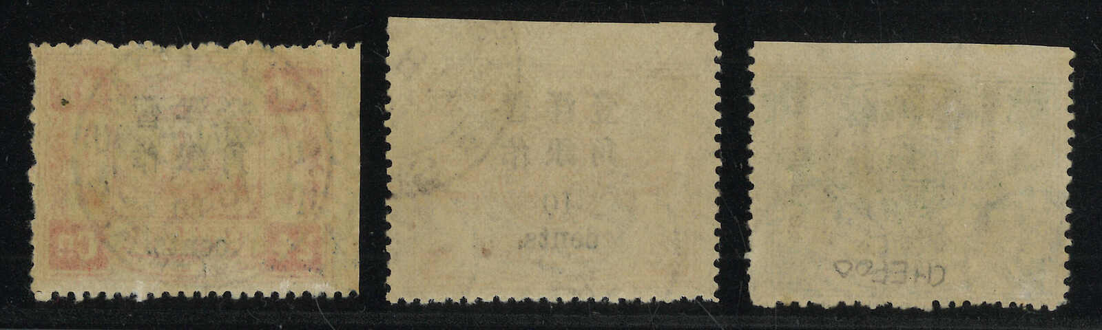 1897年1角蓋9分銀直雙連、1角蓋12分銀及3角蓋24分銀單枚,小字加蓋,每枚其中一邊漏齒,銷八卦或海關日戳。陳目44-46。(Image 1) (Image 2)