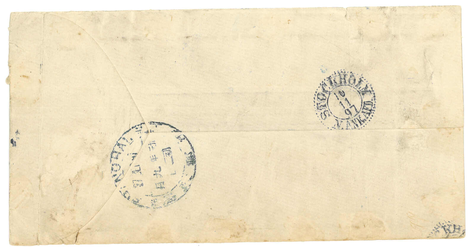 111 cover image1897 Chefoo (29 Sep) to Germany. French ovpt. 10c PSC, f.w. Empress Dowager surch large figure narrow spaced 2c/2ca, tied by Chefoo Dollar cds. Transit Shanghai (1 Oct) with dollar cds. Indicia tied by Shanghai French PO (2 Oct) cds. Arrived Hamburg.