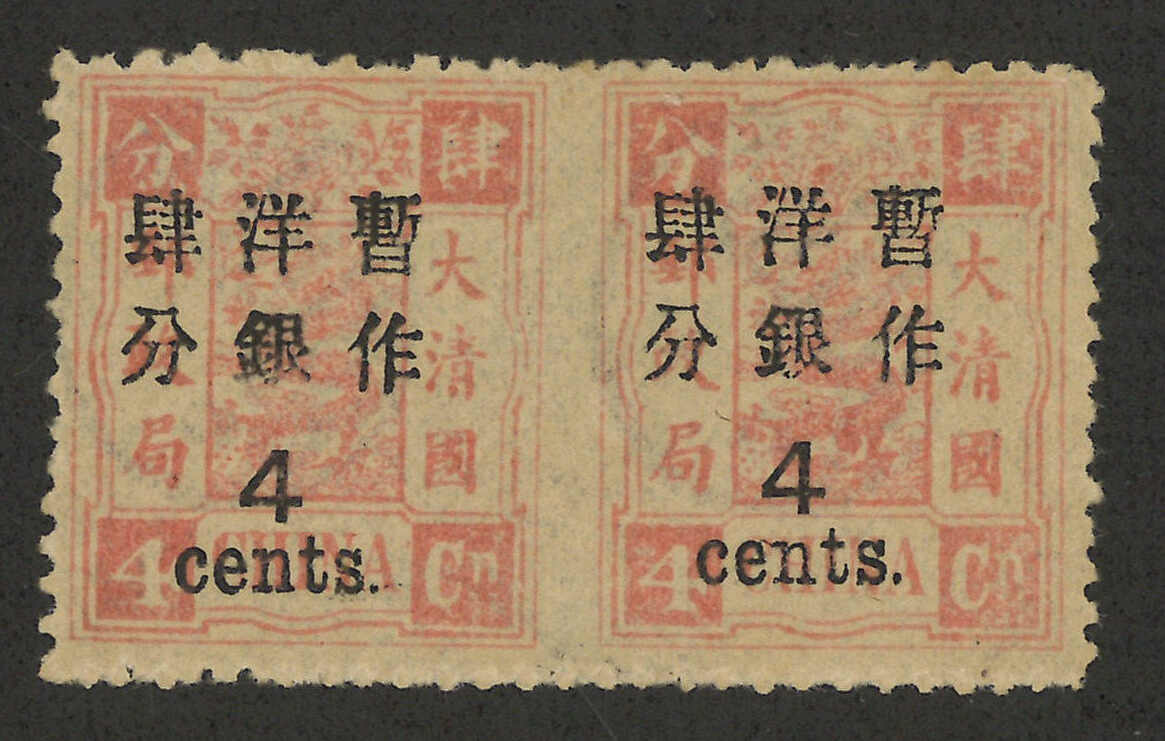 1897年4分蓋4分銀橫雙連,小字加蓋,中縫漏齒,銷上海海關1897年1月2日日戳。郵戳清晰,上品。帶有Peter Holcombe保真簽署。漏齒變異之雙連記錄中僅見少於十件,極為難得。