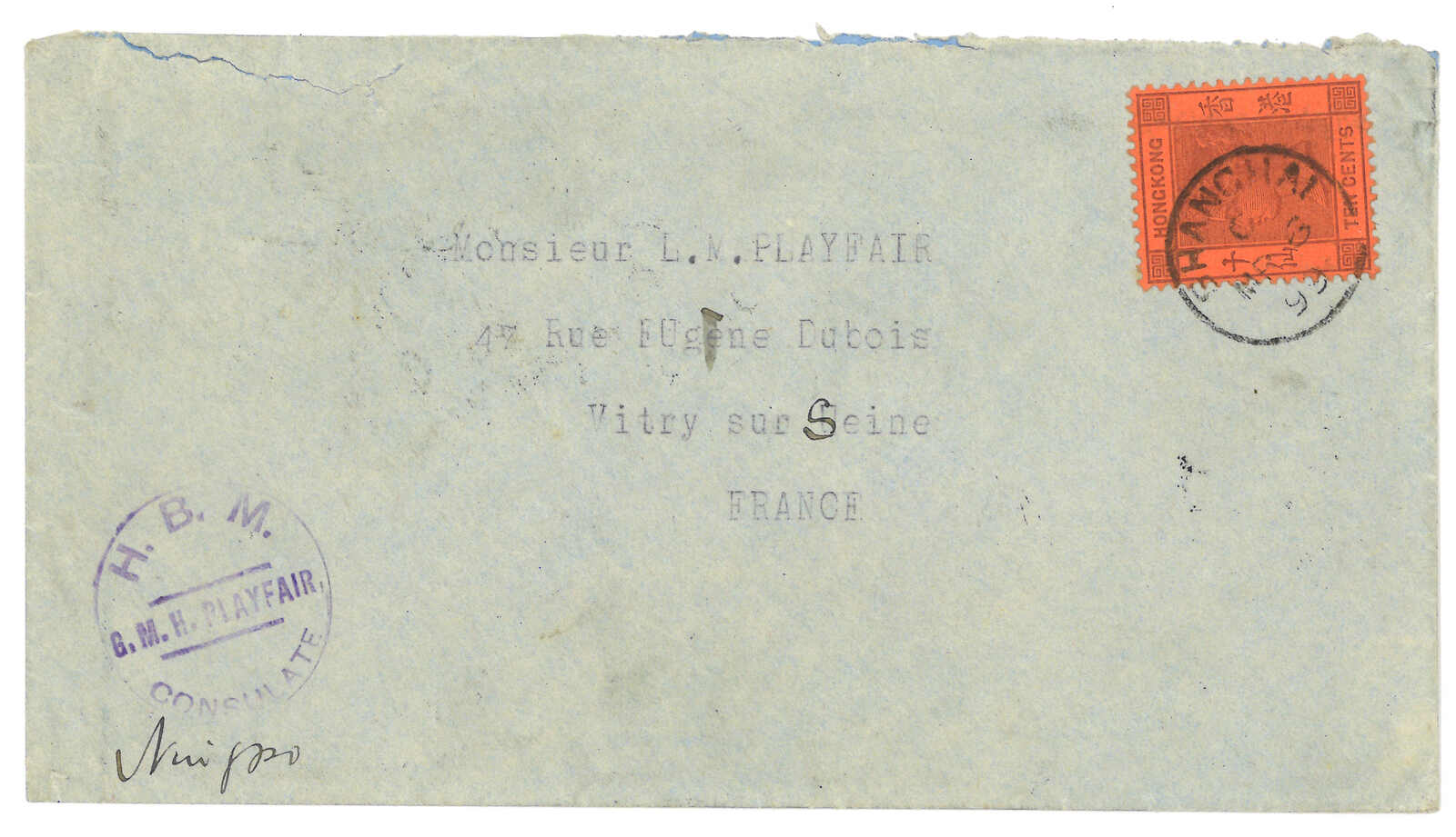 1899.3.4 寧波寄法國,背貼慈壽加蓋小字4分直雙連(上方一枚帶“4”字為3.5毫米長距變異;陳目40c)+ 半分過橋橫雙連 + 1分,銷寧波大圓戳。3.5經上海清郵。加貼香港維多利亞女皇像10仙,銷上海英局3.6日戳。3.10經香港,3.11經法國郵船。貼用加蓋變異票十分出色難得,同為寧波大圓戳之較晚例子(最晚為1899年4月)。(Image 1) (Image 2)