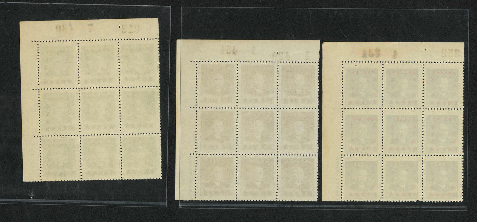 1949年華東區改值1200元、1600元及2000元蓋孫像九方連新,帶右上直角數字邊(楊目EC460-462),無貼。(Image 1) (Image 2)